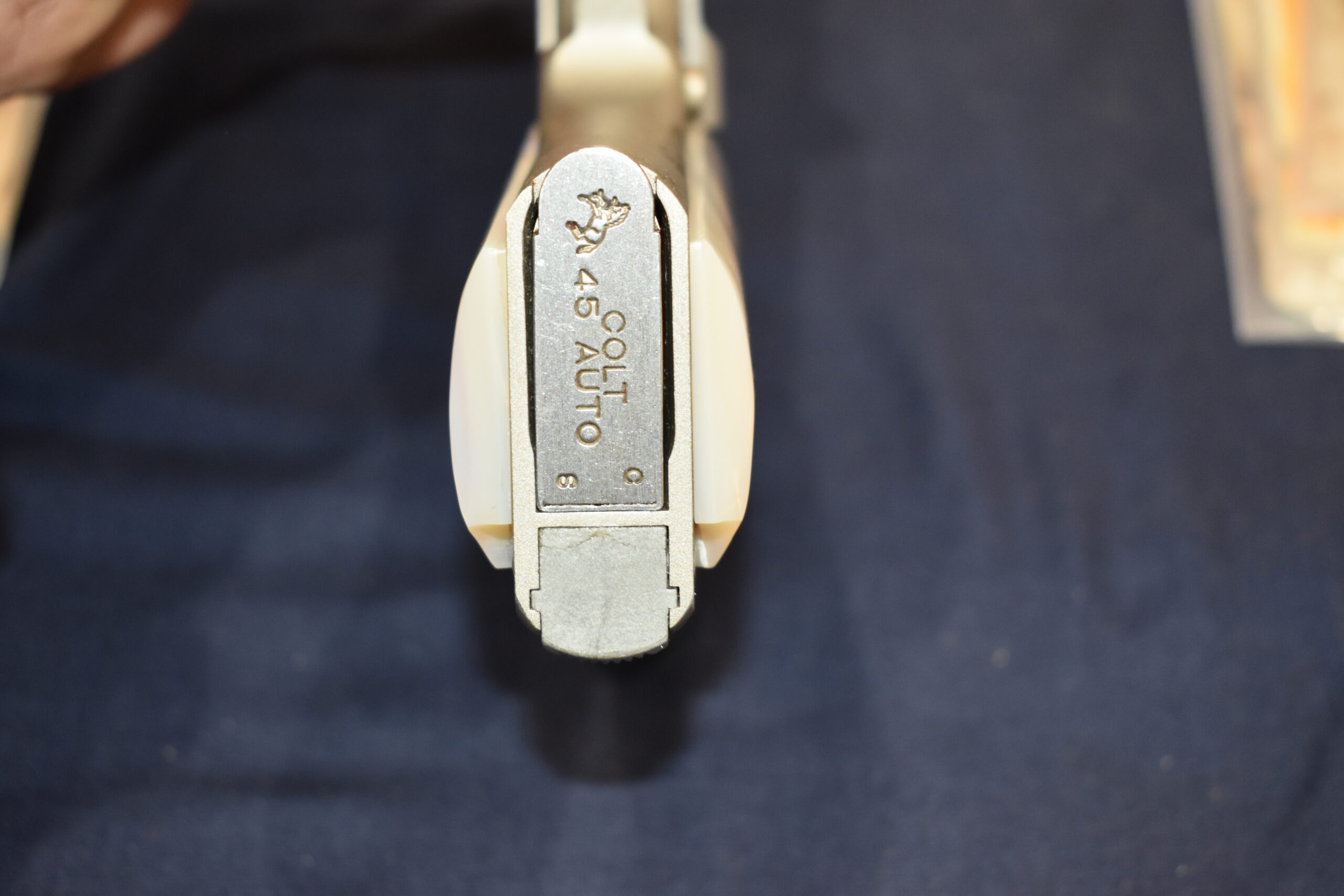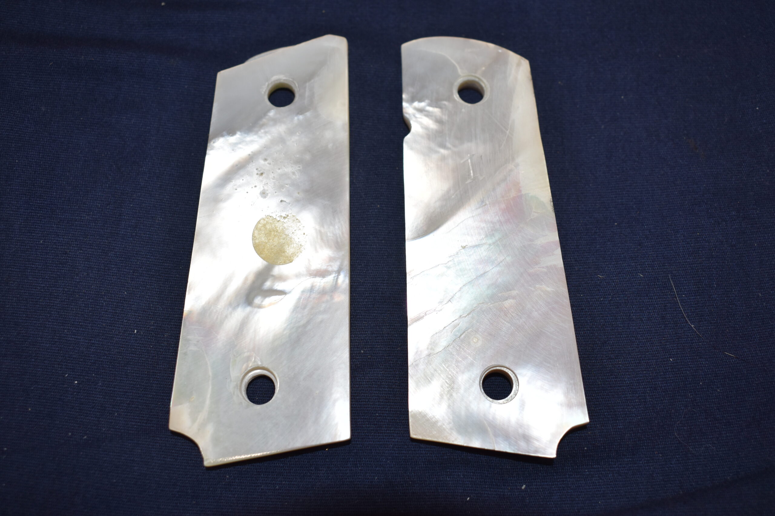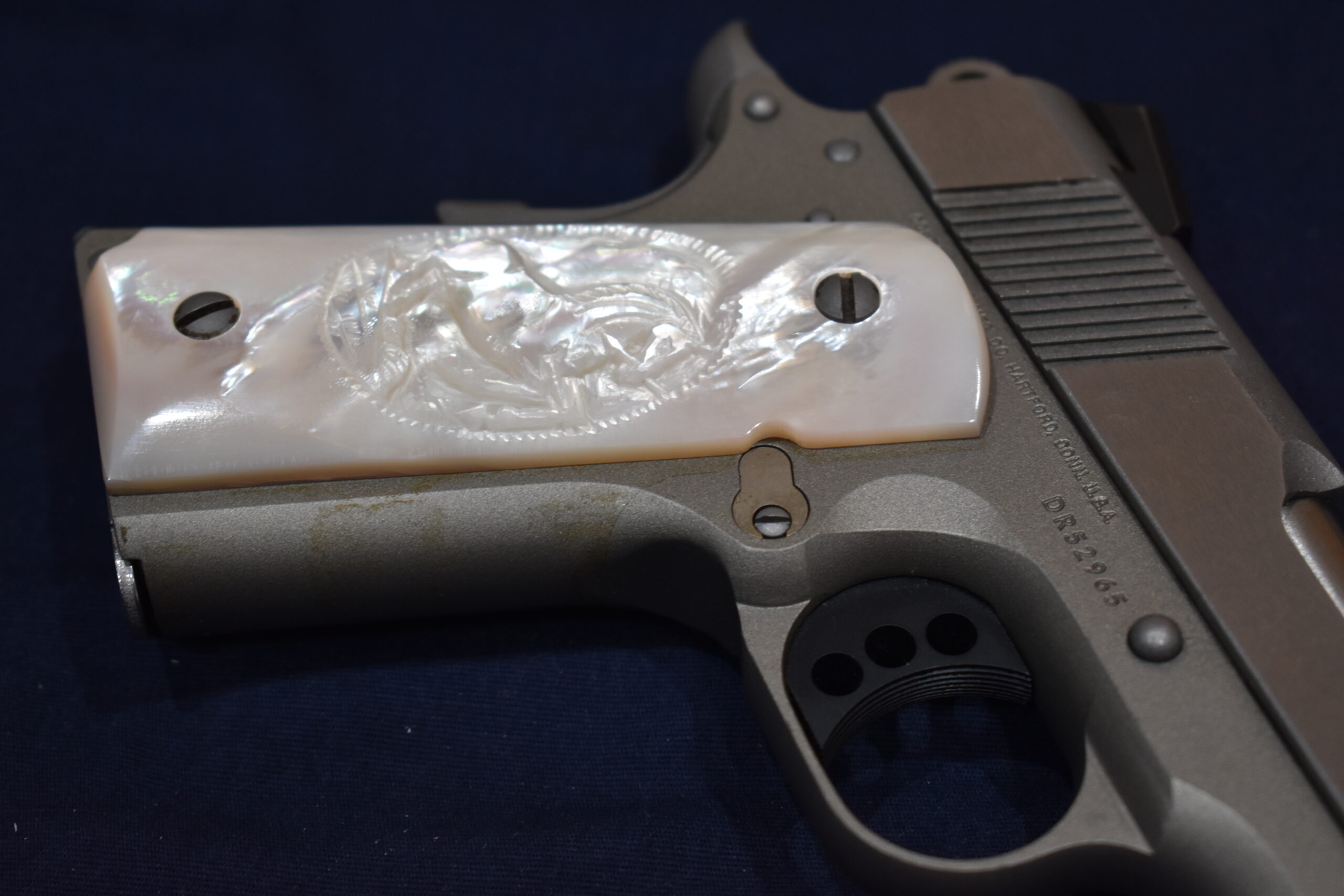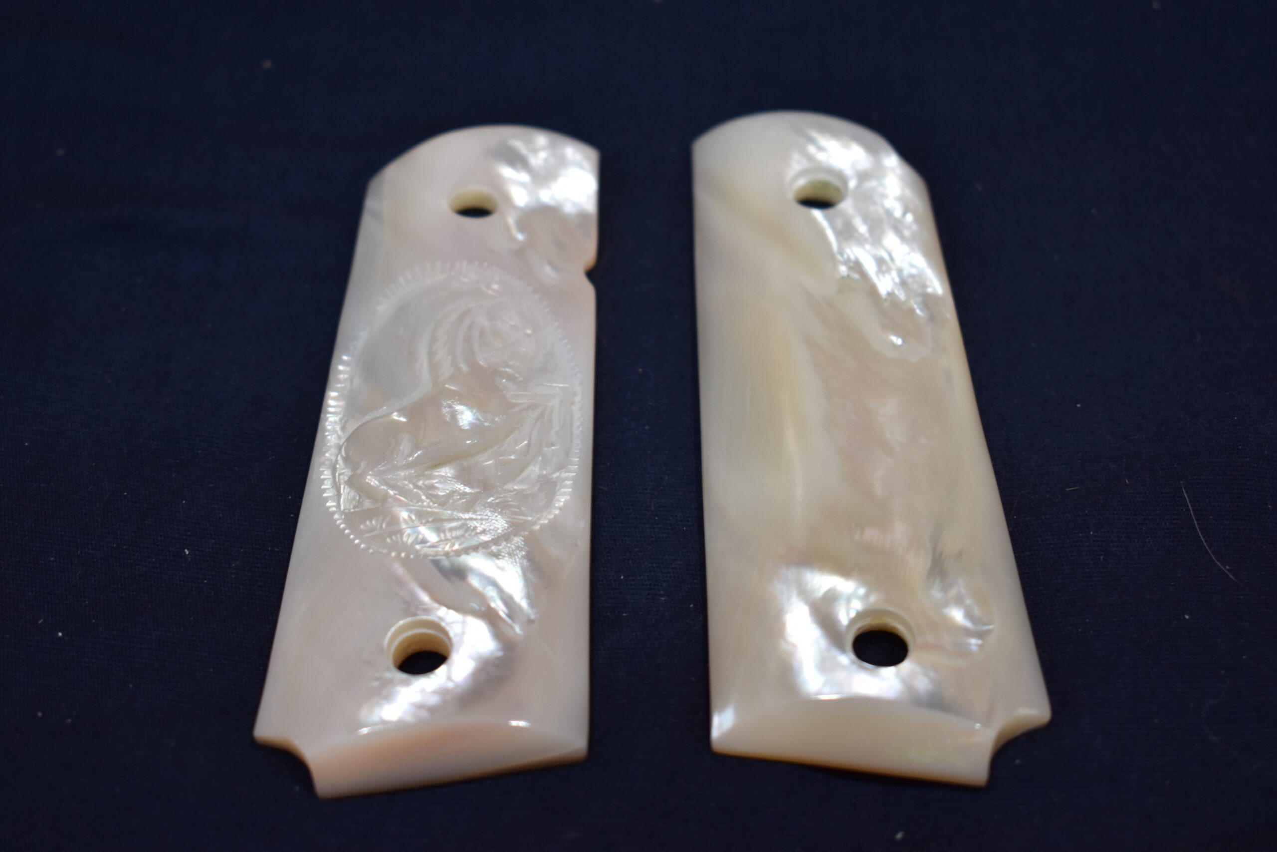 THIS IS A CUSTOM SET OF MOTHER OF PEARL GRIPS MADE TI FIT THE COMPACT OFFICER’S MODREL OR DEFENDER. THEY WILL NOT FIT THE FULL SIZE GOVERNMENT MODEL AND THE MID-SIZE COMMANDER MODEL 1911 FRAME. THESE ARE GENUINE MOTHER OF PEARL NOT IMITATION. THIS SET HAS THE COLT HORSI IN THE CIRCLE CARVED ON THE RIGHT GRIP. MOTHER OF PEARL GRIPS HAVE LONG BEEN A STATUS SYMBOL AND THEY ARE GETTING HARDER TO FIND & A CARVED SET ALMOST IMPOSSIBLE. THEY WILL COME WITH A SET OF RUBBER O RINGS THAT NEED TO BE USED WHEN YOU MOUNT THE GRIPS. THEY ARE SHOWN MOUNTED ON A COLT DEFENDER. TAKE A CLOSE LOOK AT THE PICTURES AS THEY DESCRIBE THE GRIPS BETTER THAN WORDS.