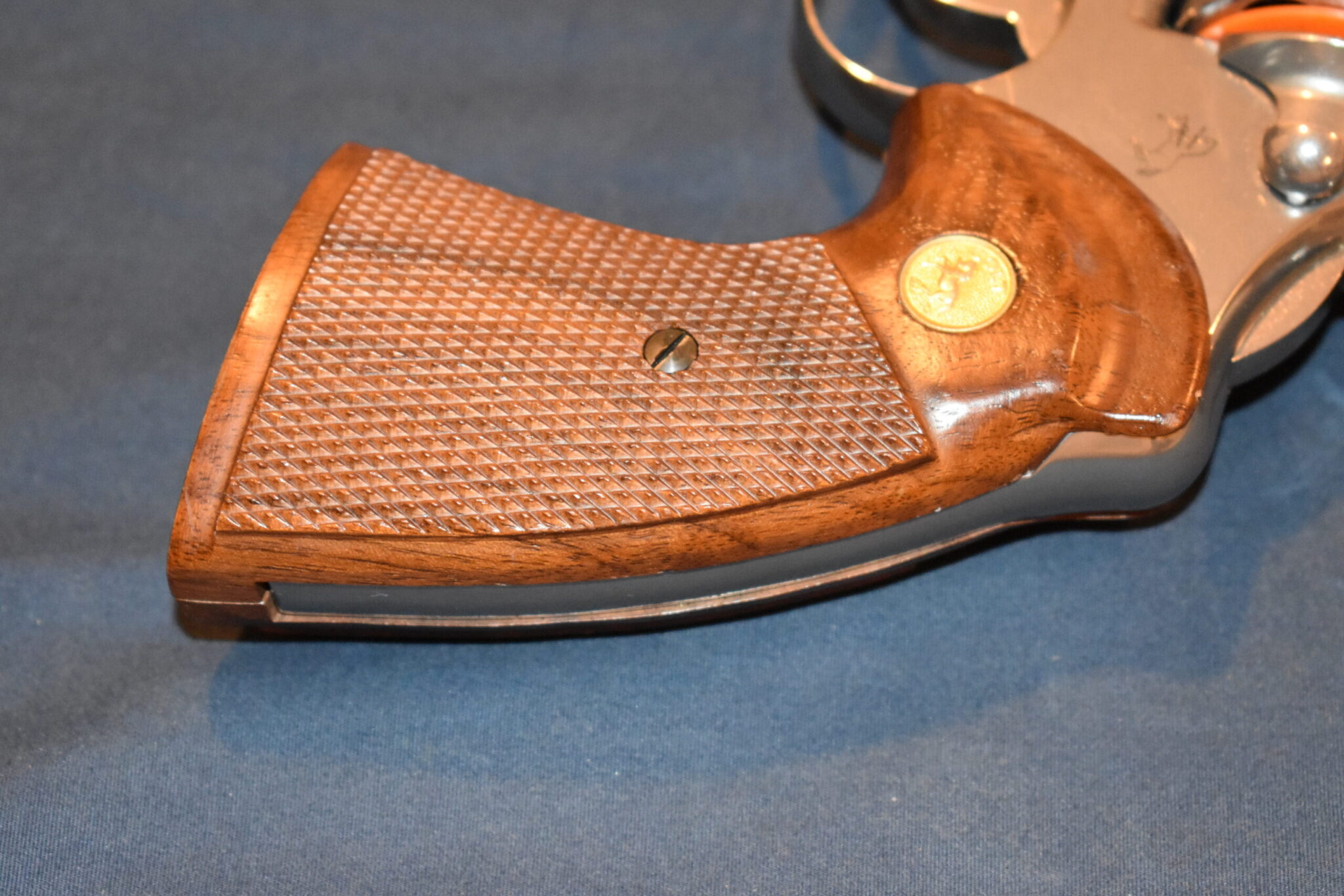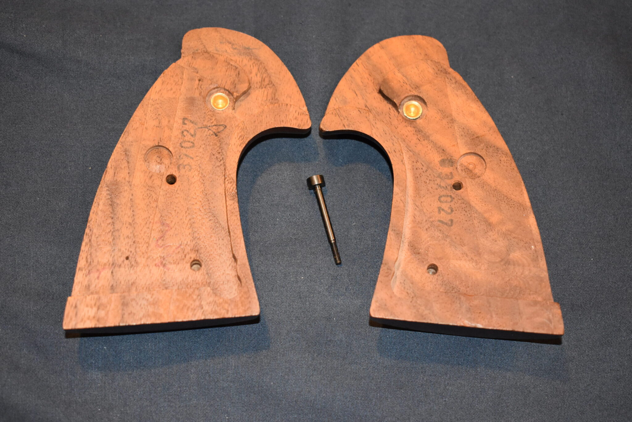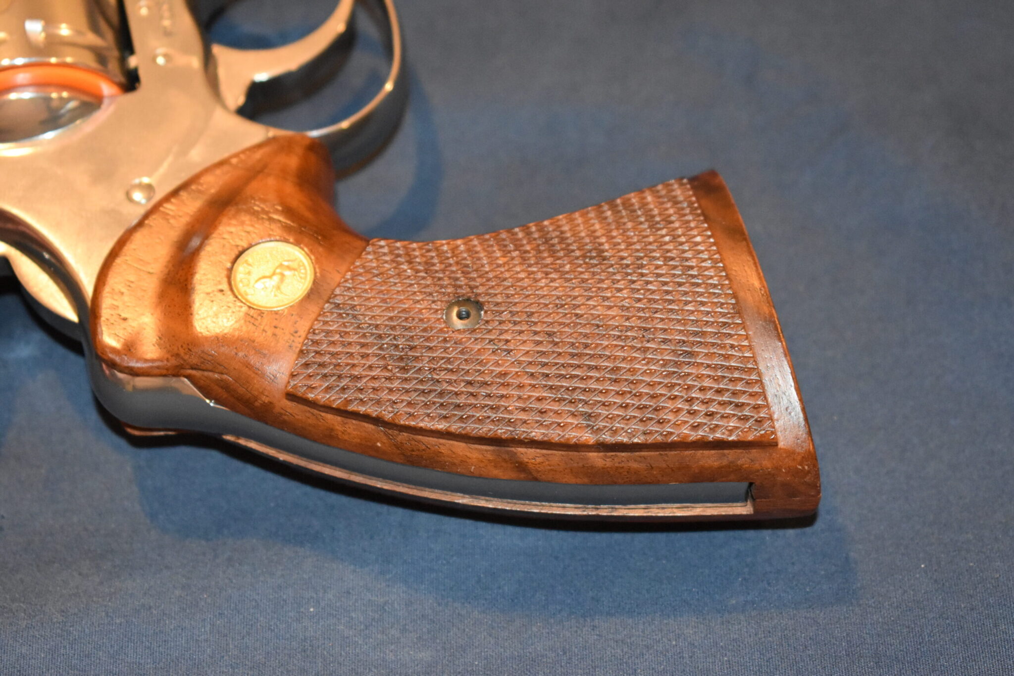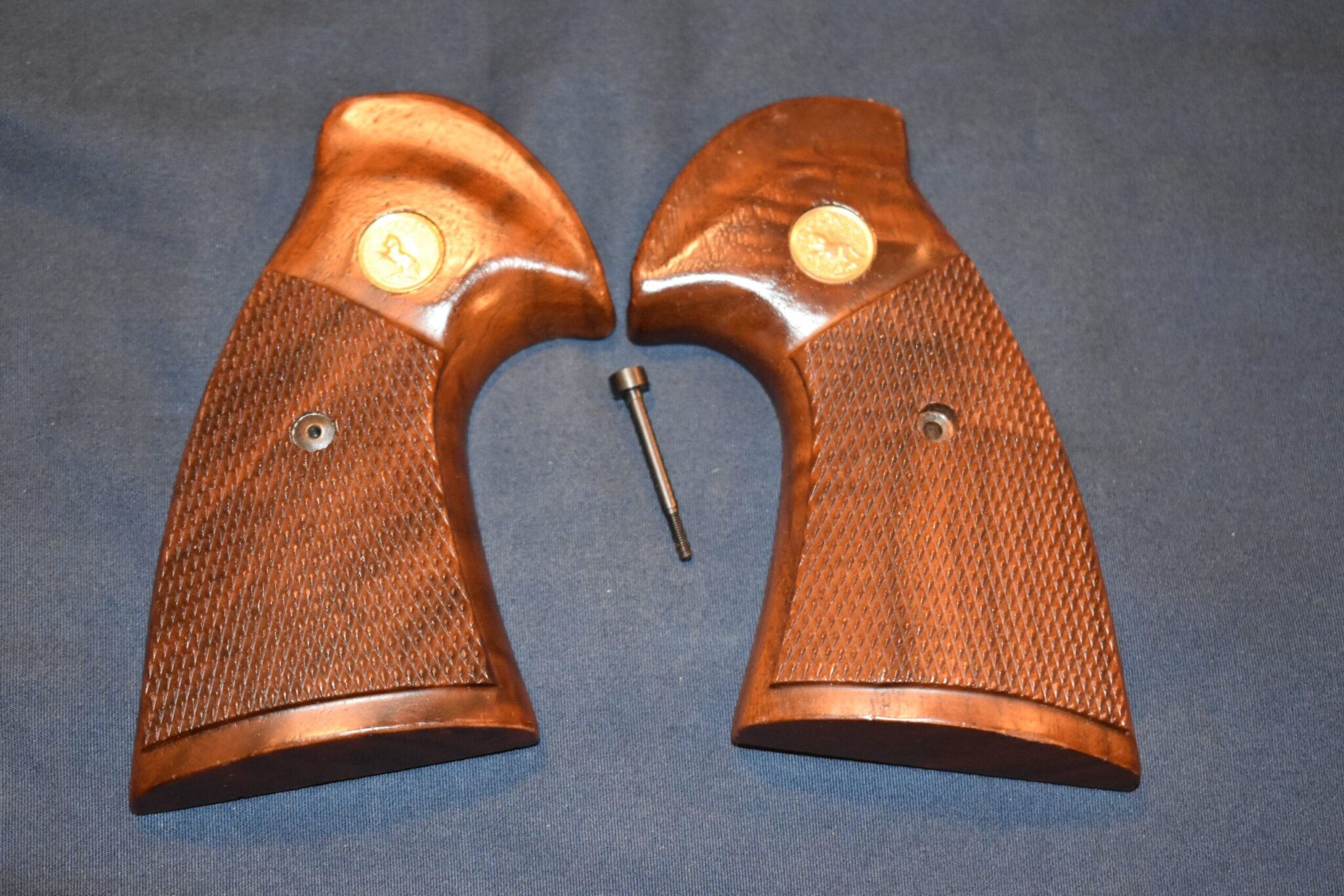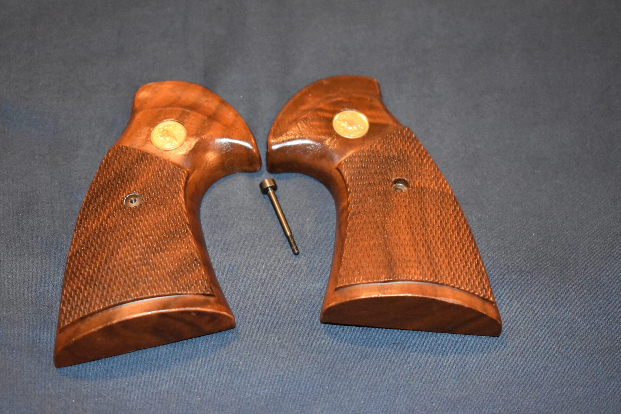 THIS IS A FACTORY SET OF TARGET GRIPS THAT WILL FIT THE COLT PYTHON REVOLVERS. THIS SET WILL NOT FIT THE COLT OFFICER’S MODEL MATCH DUE TO SCREW LOCATION. THIS SET IS IN EXCELLENT CONDITION WITH VERY LITTLE (IF ANY!!!) WEAR. THEY ARE SHOWN MOUNTED ON A 4″ STAINLESS PYTHON. TAKE A CLOSE LOOK AT THE PICTURES AS THEY DESCRIBE THE GRIPS BETTER THAN WORDS. SHIPPING WILL BE $8.50 PRIORITY MAIL