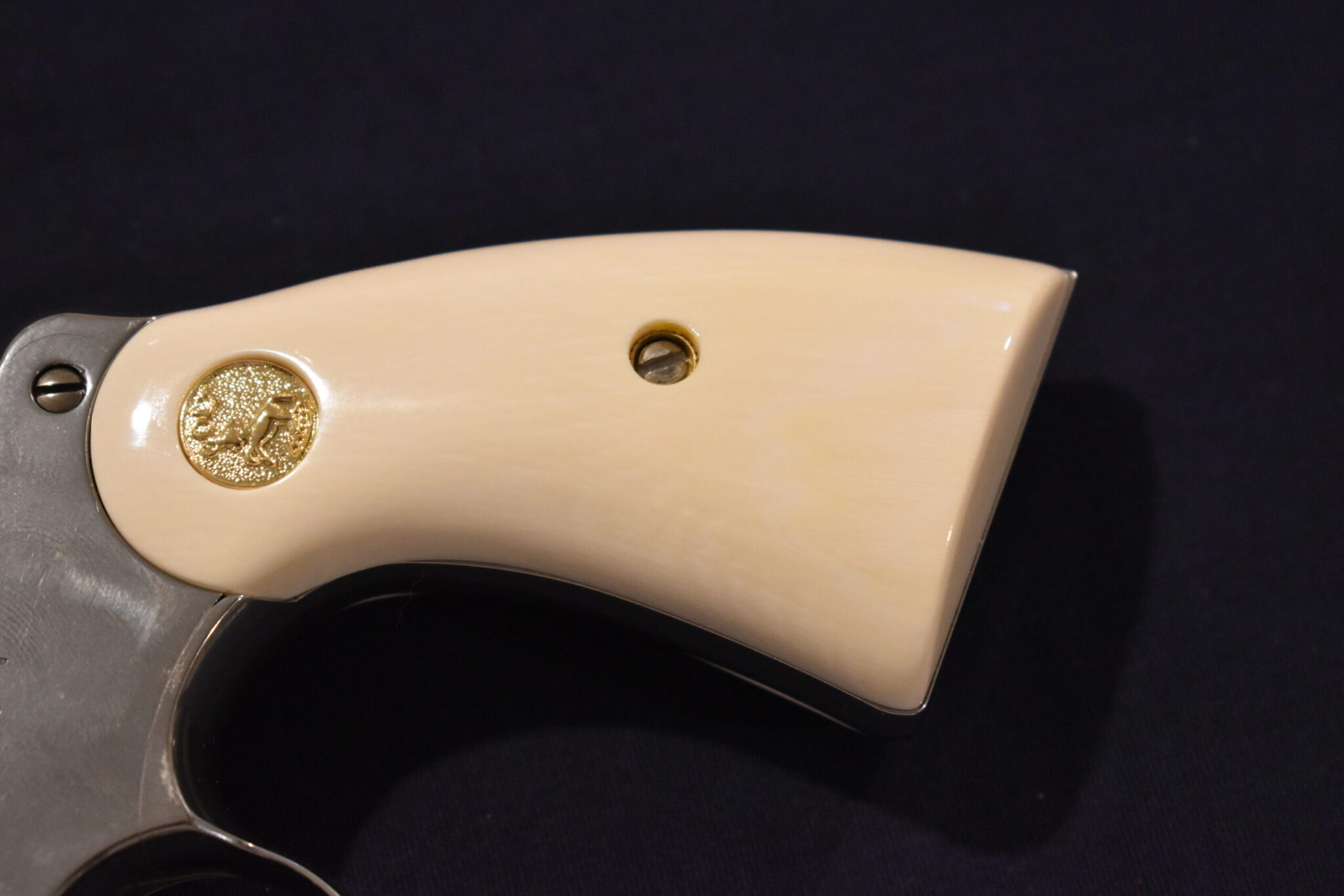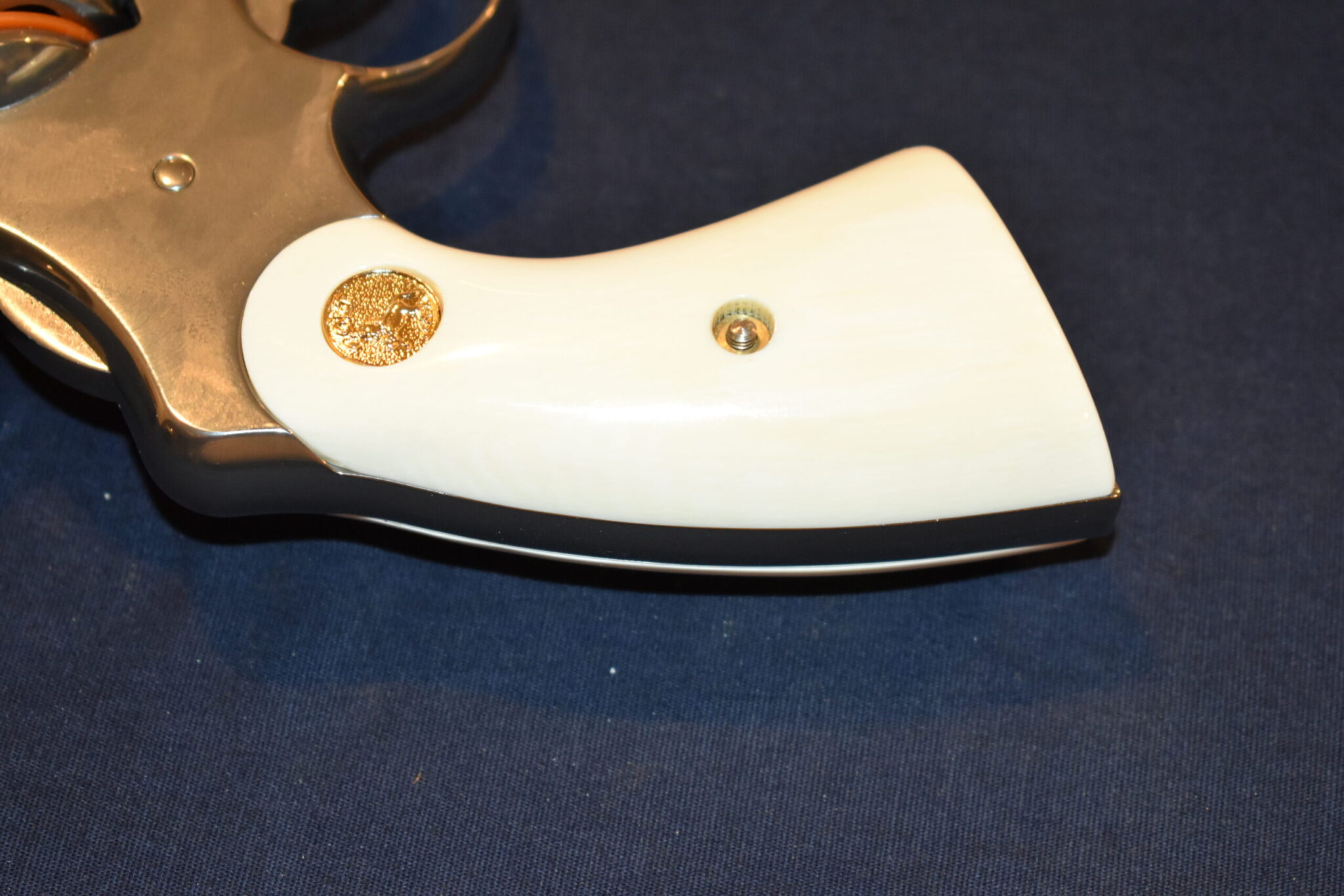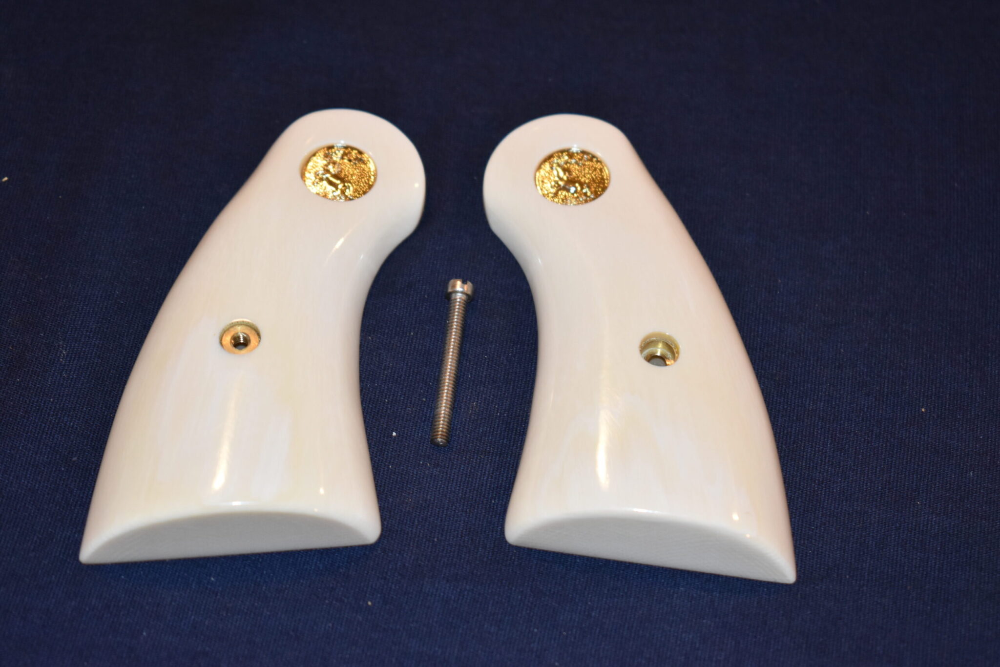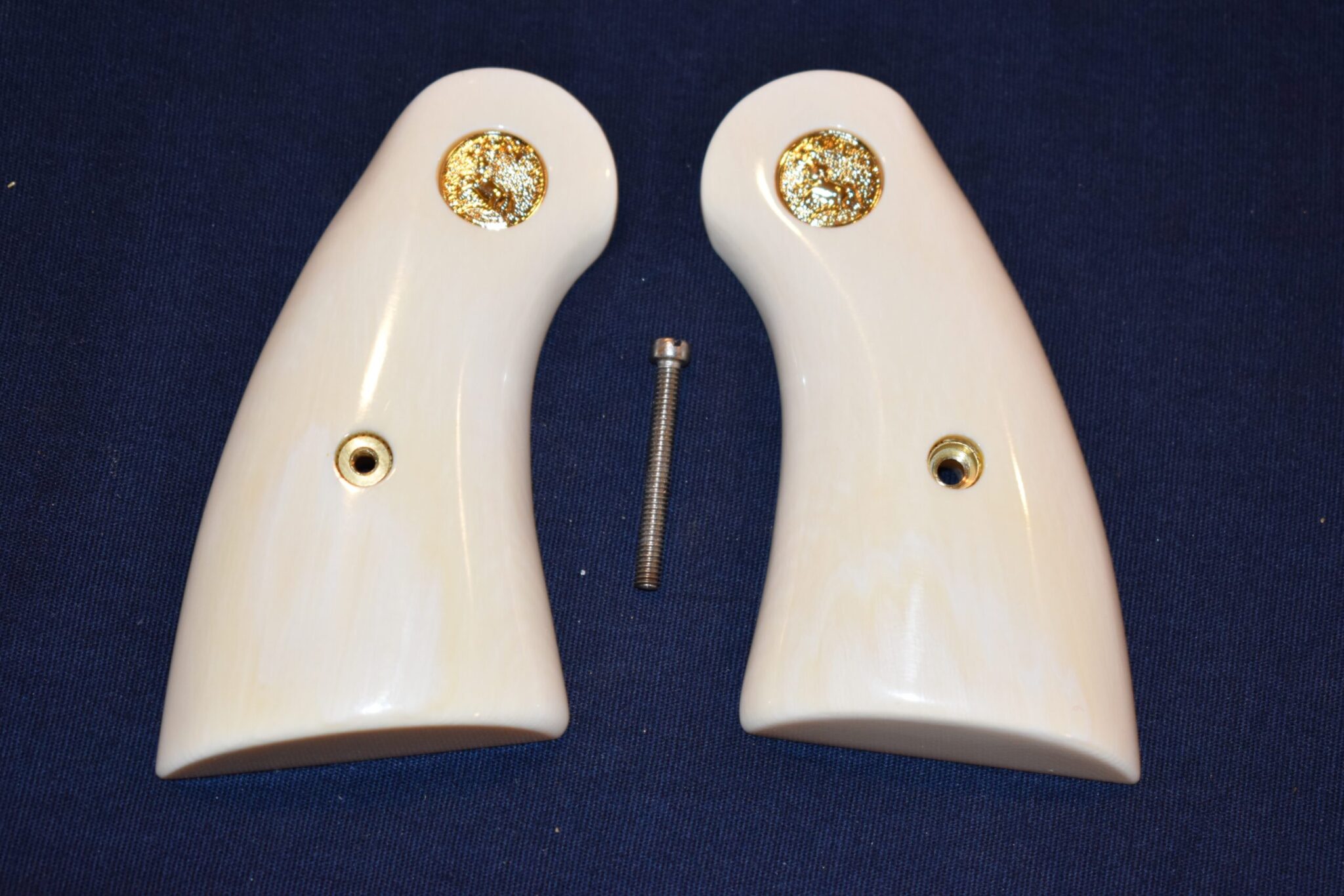 THIS IS A SET OF IVORY SERVICE GRIPS THAT WILL FIT THE COLT PYTHON, OFFICER’S MODEL MATCH & OTHER I FRAME REVOLVERS. THESE ARE GENUINE ELEPHANT IVORY MADE FROM LEGALLY IMPORTED IVORY BEFORE THE BAN. THIS SET IS IN EXCELLENT CONDITION AND HAS ONLY BEEN MOUNTED ON A FRAME FOR PICTURES. Â THIS IS SHOWN WITH COLT GOLD MEDALLIONS. Â THEY ARE SHOWN ON A NEWER 4″ STAINLESS PYTHON. TAKE A CLOSE LOOK AT THE PICTURES AS THEY DESCRIBE THE GRIPS BETTER THAN WORDS. SHIPPING WILL BE $8.50 PRIORITY MAIL