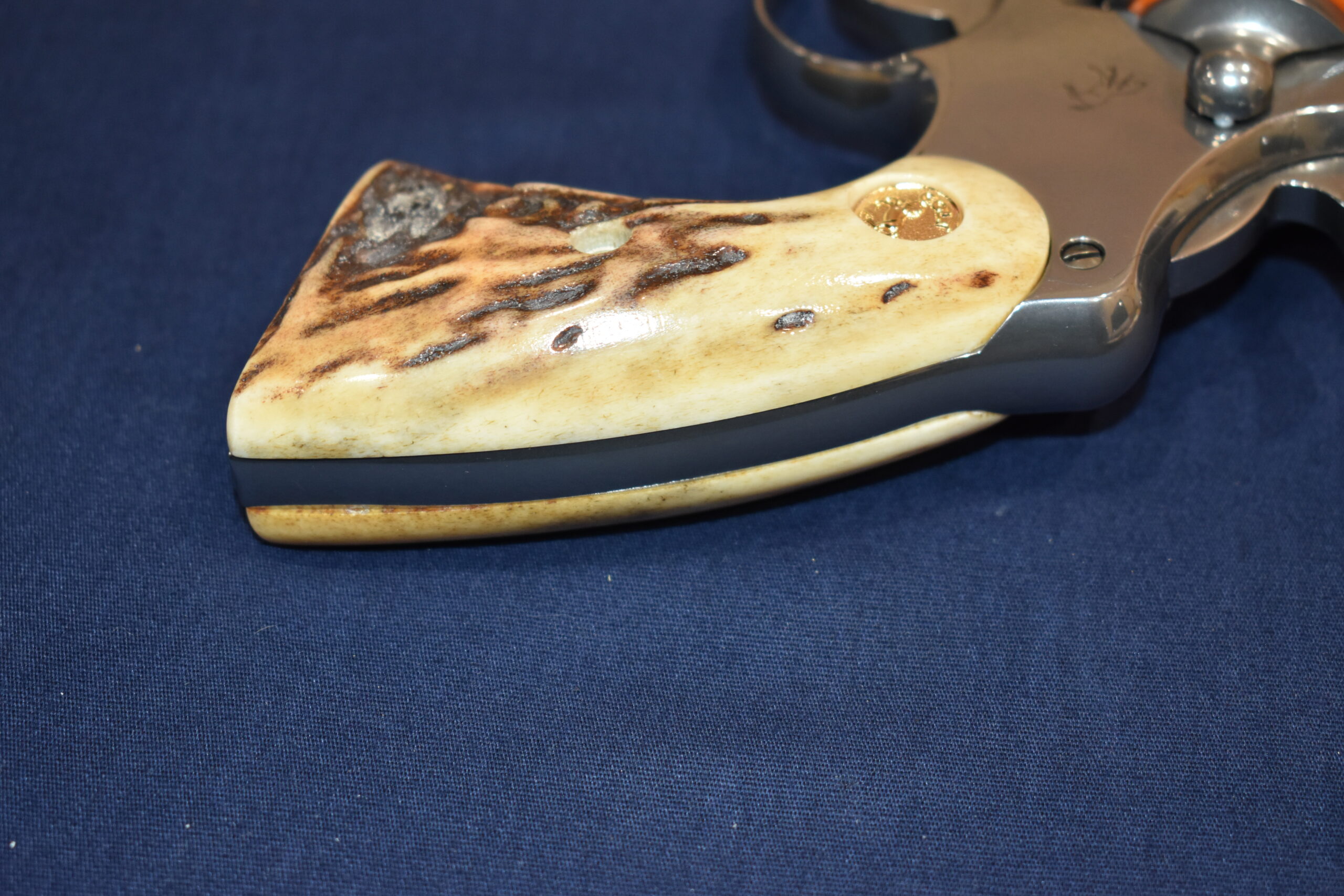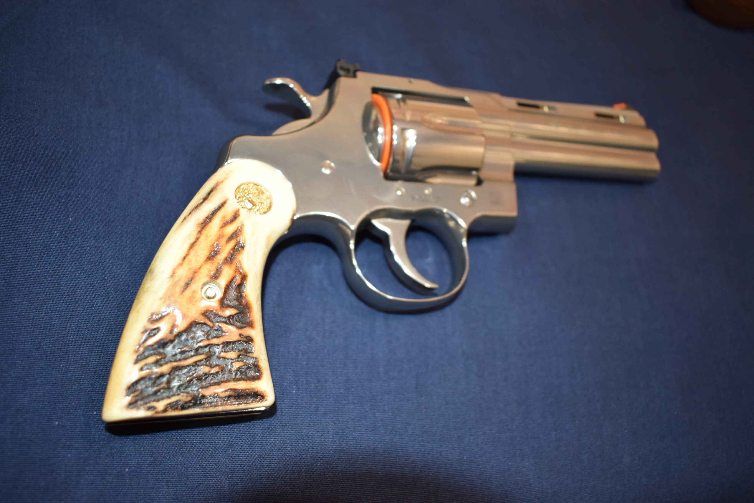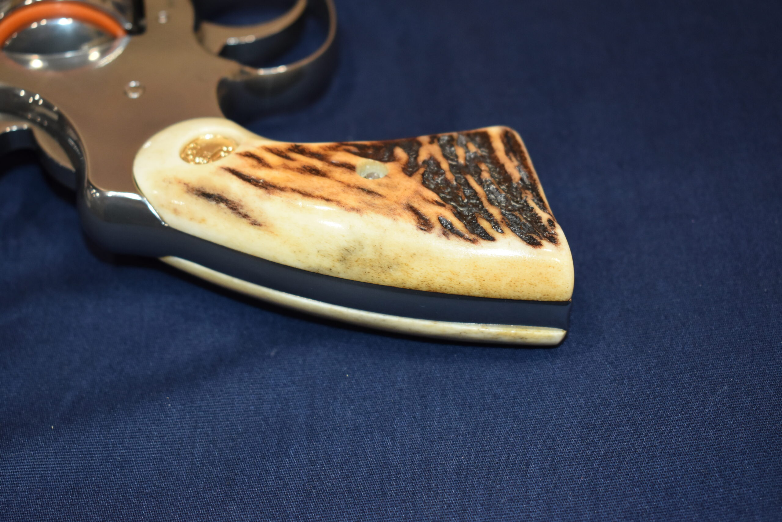 THIS IS A CUSTOM SET OF VINTAGE SAMBAR STAG MADE TO FIT THE COLT PYTHON, OFFICER’S MODEL MATCH, OFFICIAL POLICE, & OTHER I FRAME REVOLVERS. THESE ARE GENUINE SAMBAR STAG NOT IMITATION. THIS SET HAS SOME OF THE NICEST BARK YOU WILL FIND AND SOME GREAT LOOKING PATINA! IT WOULD BE HARD TO FINE A BETTER LOOKING SET. I HAD A SET OF GOLD COLT MEDALLIONS INSTALLED. THEY ARE SHOWN MOUNTED ON ONE ON THE NEW STAINLESS PYTHONS. TAKE A CLOSE LOOK AT THE PICTURES AS THEY SPEAK LOUDER THAN WORDS.Â