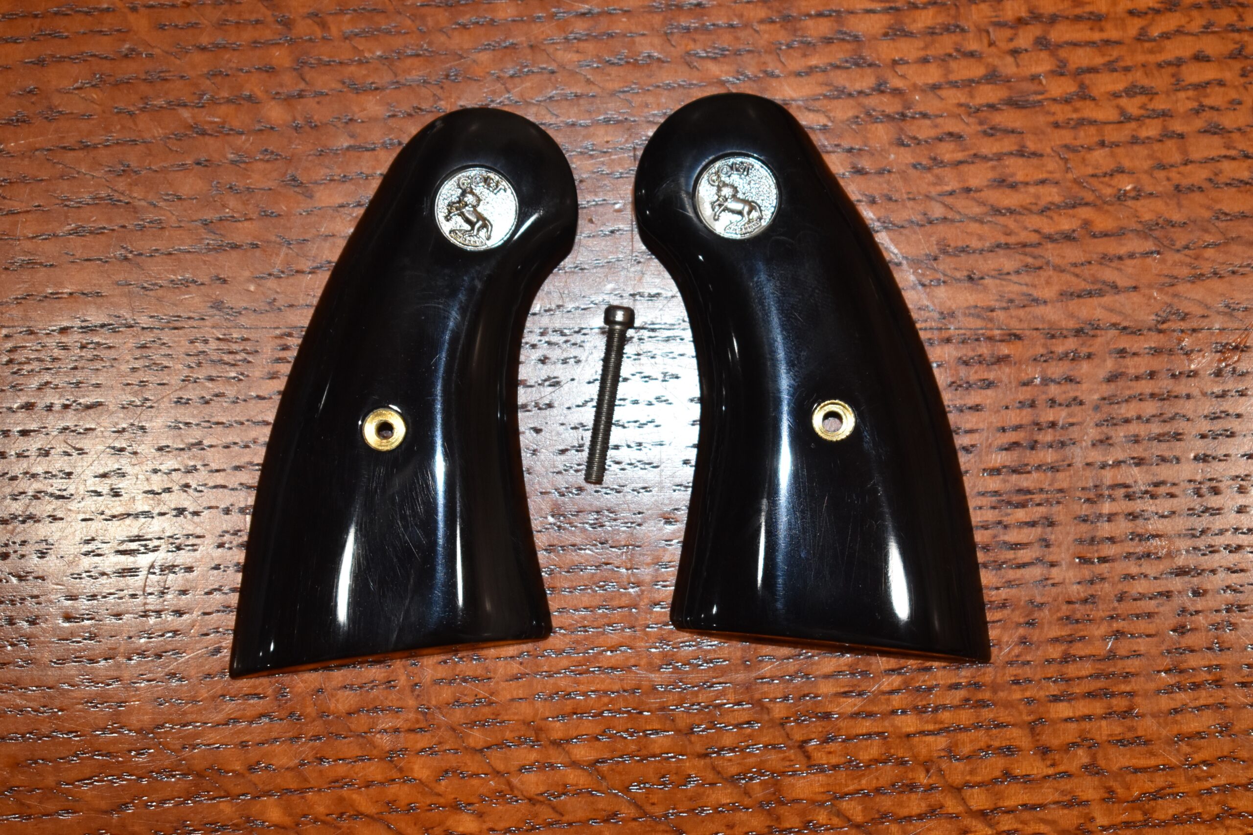 THIS IS A CUSTOM SET OF PREMIUM GRADE BUFFALO HORN GRIPS MADE TO FIT THE COLT PYTHON & OTHER I FRAME REVOLVERS SUCH AS THE OFFICER'S MODEL MATCH AND OFFICIAL POLICE. THESE ARE GENUINE BUFFALO HORN NOT IMITATION. THIS SET HAS SILVER MEDALLIONS INSTALLED & ARE A DEEP BLACK COLOR. THEY ARE SHOWN MOUNTED ON A 4" STAINLESS PYTHON. AS WITH ALL NATURAL MATERIALS, THERE MAY BE SOME SLIGHT FITTING INVOLVED. TAKE A CLOSE LOOK AT THE PICTURES AS THEY DESCRIBE THE GRIPS BETTER THAN WORDS.Â