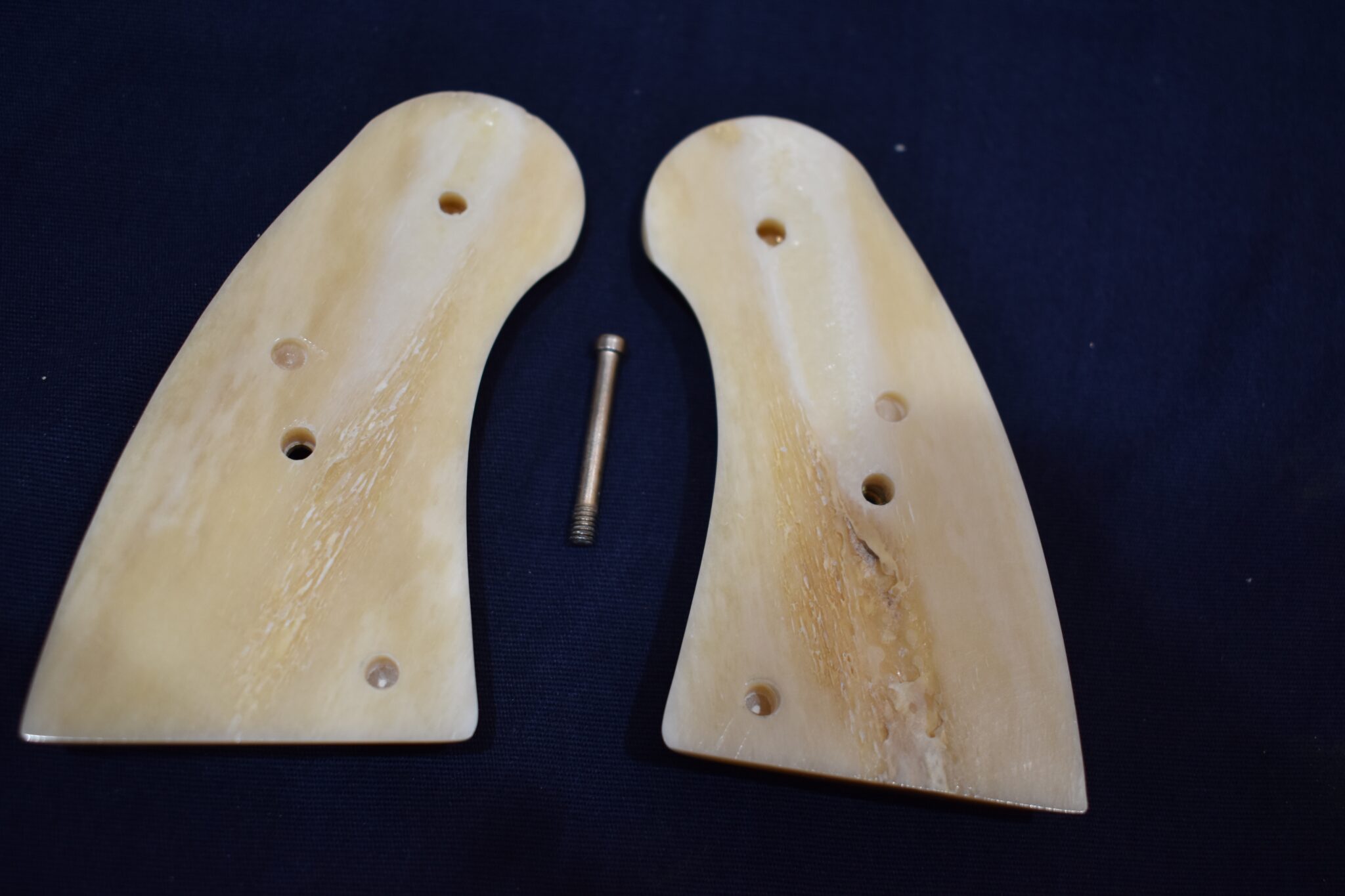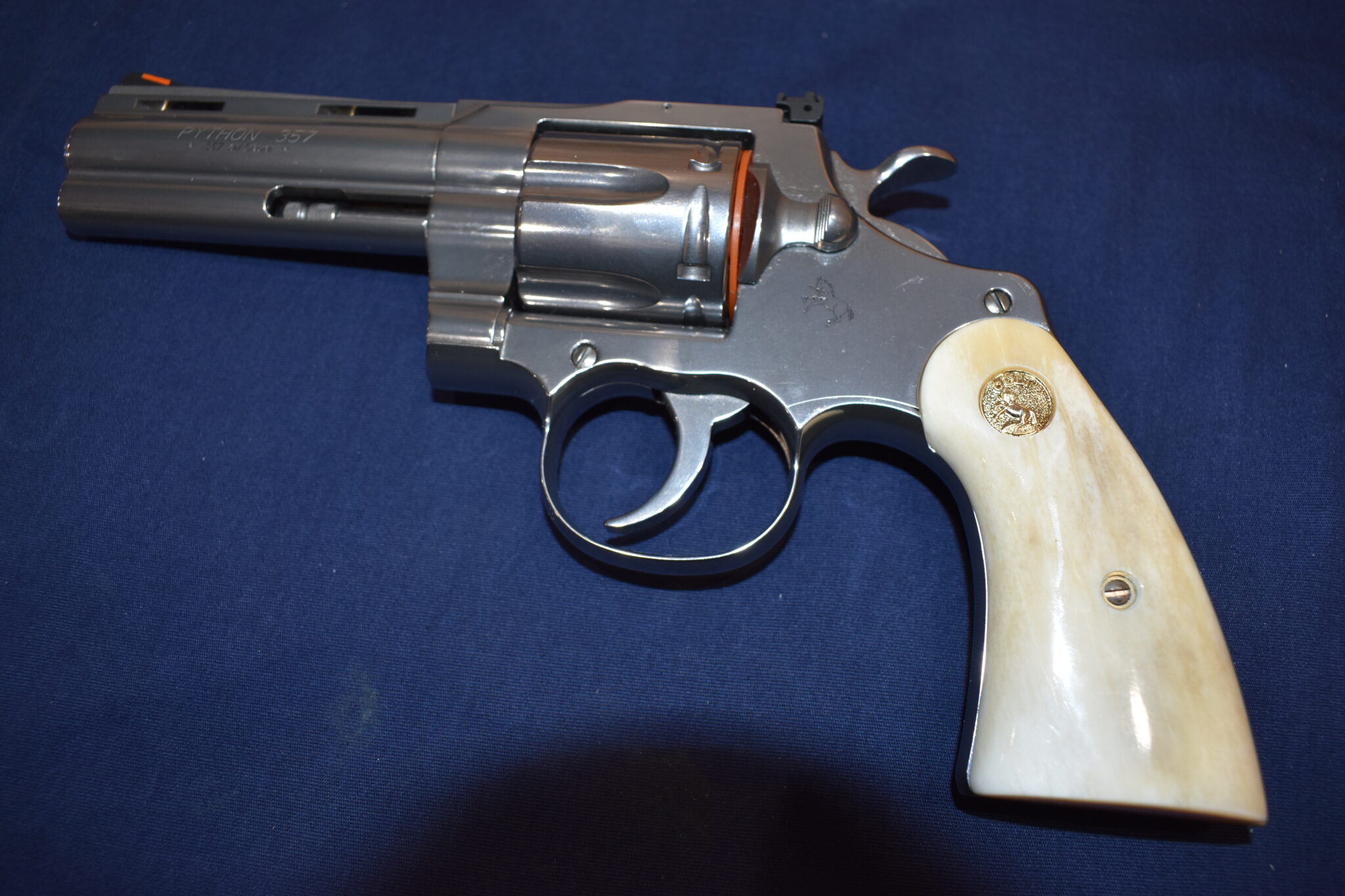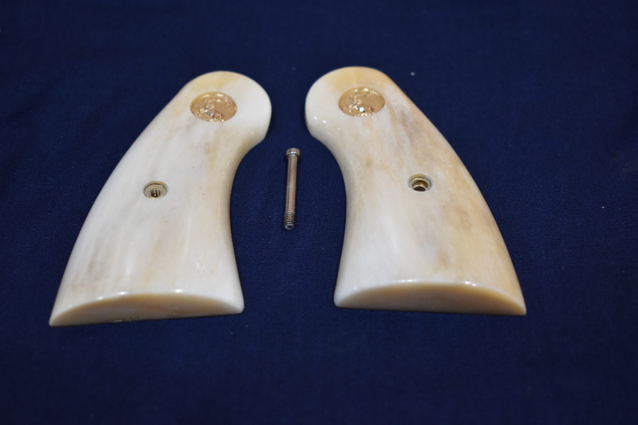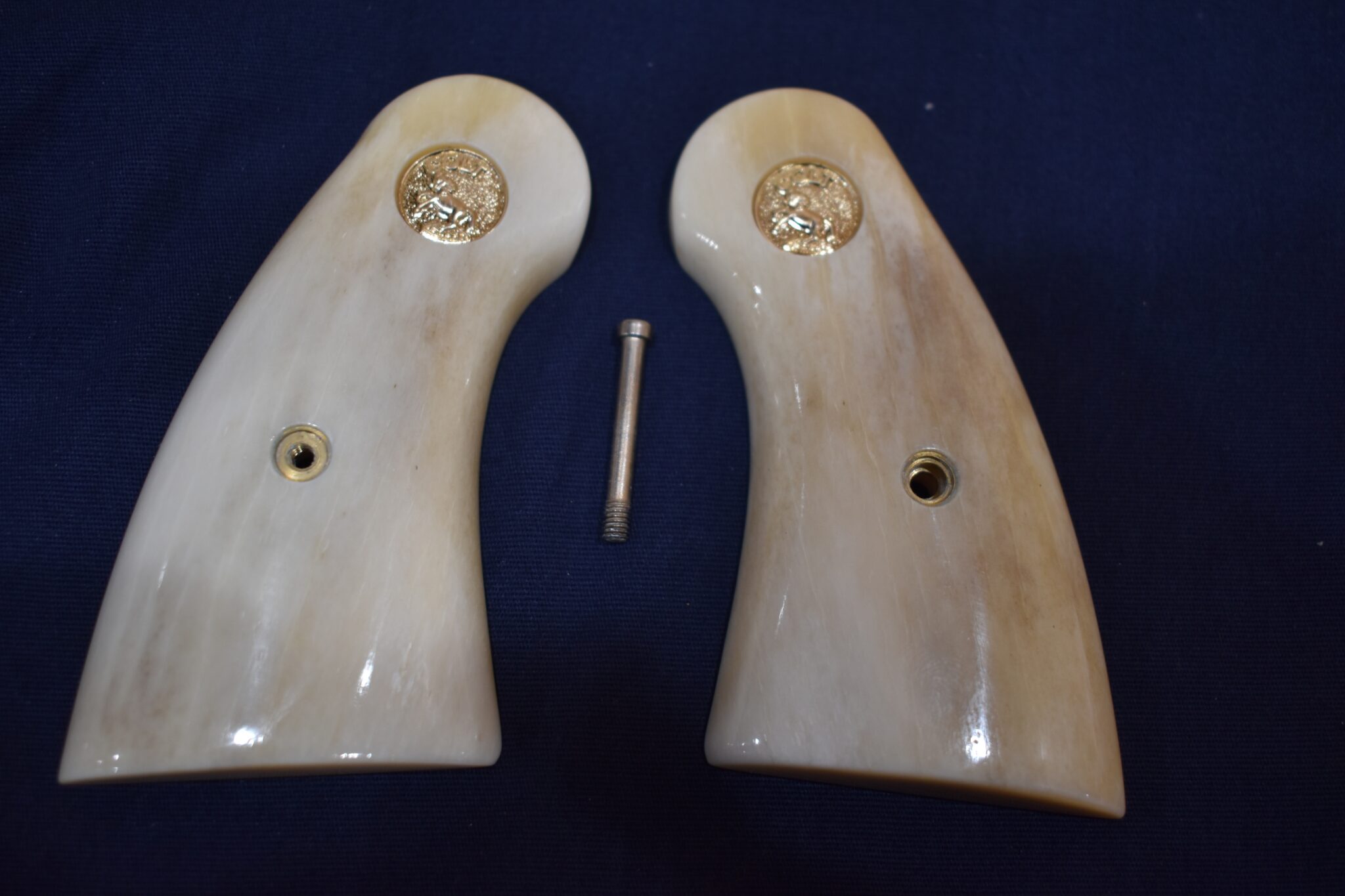 THIS IS A CUSTOM SET OF PREMIUM GRADE GIRAFFE BONE GRIPS MADE TO FIT THE COLT PYTHON & OTHER I FRAME REVOLVERS SUCH AS THE OFFICER’S MODEL MATCH AND OFFICIAL POLICE. THEY ARE GENUINE GIRAFFE BONE NOT IMITATION. THEY HAVE A CREAMY WHITE COLOR WITH STREAKS OF BROWN. THEY GIVE YOU THE LOOK OF BARK IVORY AT 1/2 THE PRICE!!!!. THIS SET HAS GOLD COLT MEDALLIONS INSTALLED. THEY ARE SHOWN MOUNTED ON ONE OF THE NEW 4″ STAINLESS PYTHONS. TAKE A CLOSE LOOK AT THE PICTURES AS THEY DESCRIBE THE GRIPS BETTER THAN WORDS.Â