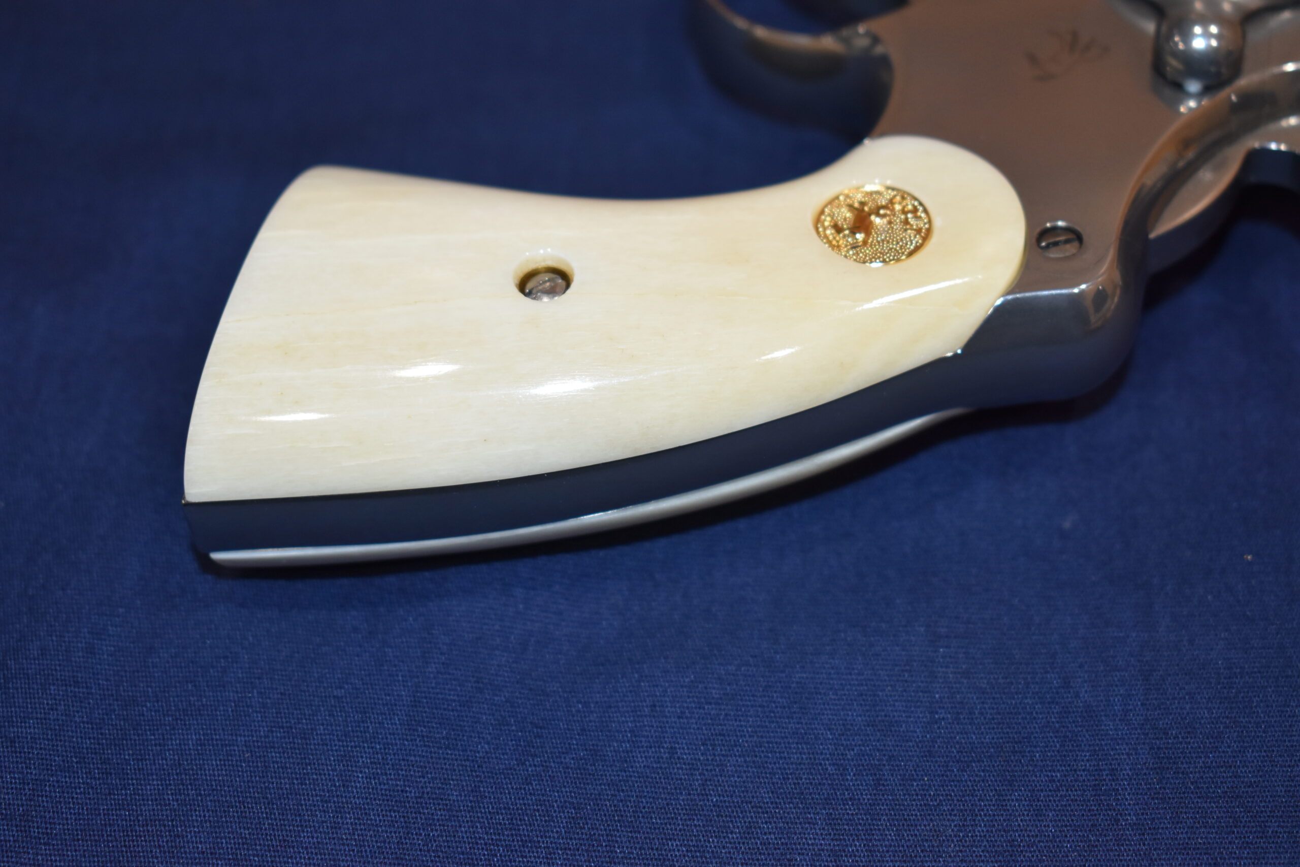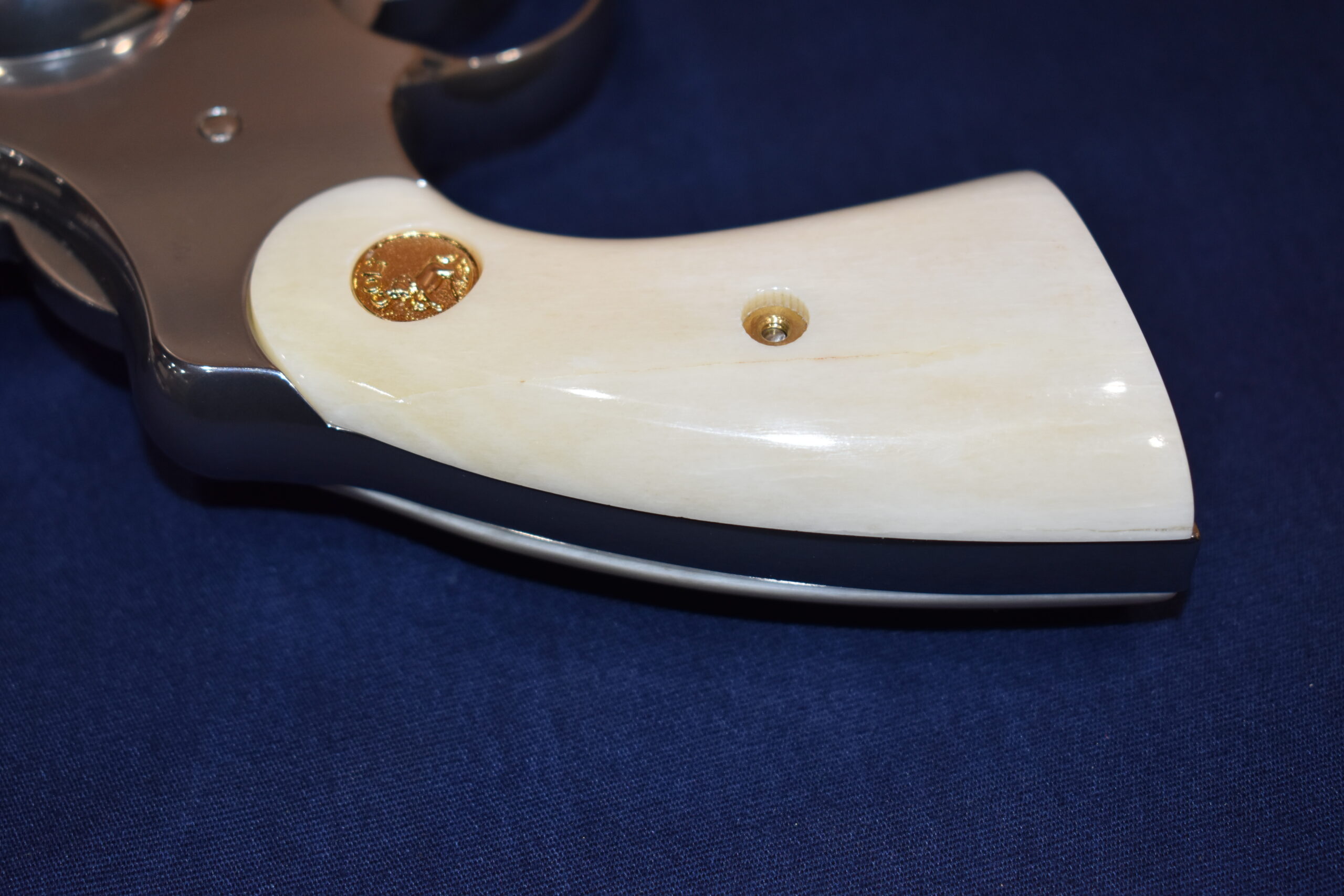 THIS IS A CUSTOM SET OF PREMIUM GRADE GIRAFFE BONE GRIPS MADE TO FIT THE COLT PYTHON & OTHER I FRAME REVOLVERS SUCH AS THE OFFICER’S MODEL MATCH AND OFFICIAL POLICE. THEY ARE GENUINE GIRAFFE BONE NOT IMITATION. THEY HAVE A CREAMY WHITE COLOR THAT REMINDS YOU OF IVORY. THIS SET HAS GOLD COLT MEDALLIONS INSTALLED. THEY ARE SHOWN MOUNTED ON ONE OF THE NEW 4″ STAINLESS PYTHONS. TAKE A CLOSE LOOK AT THE PICTURES AS THEY DESCRIBE THE GRIPS BETTER THAN WORDS.Â