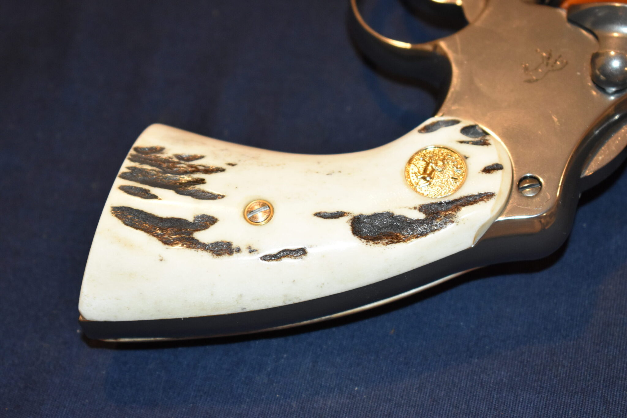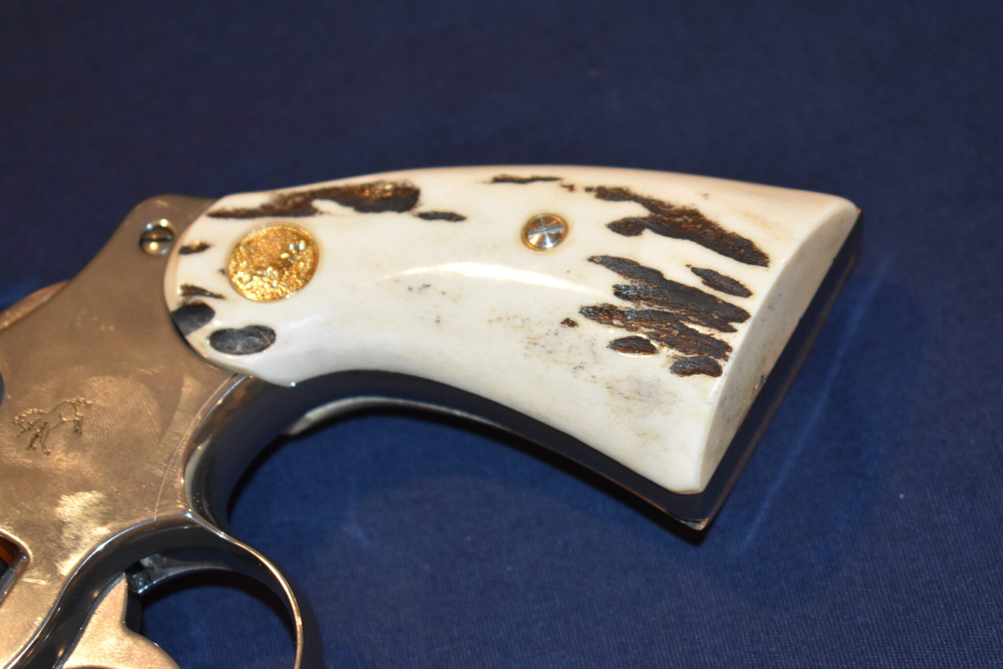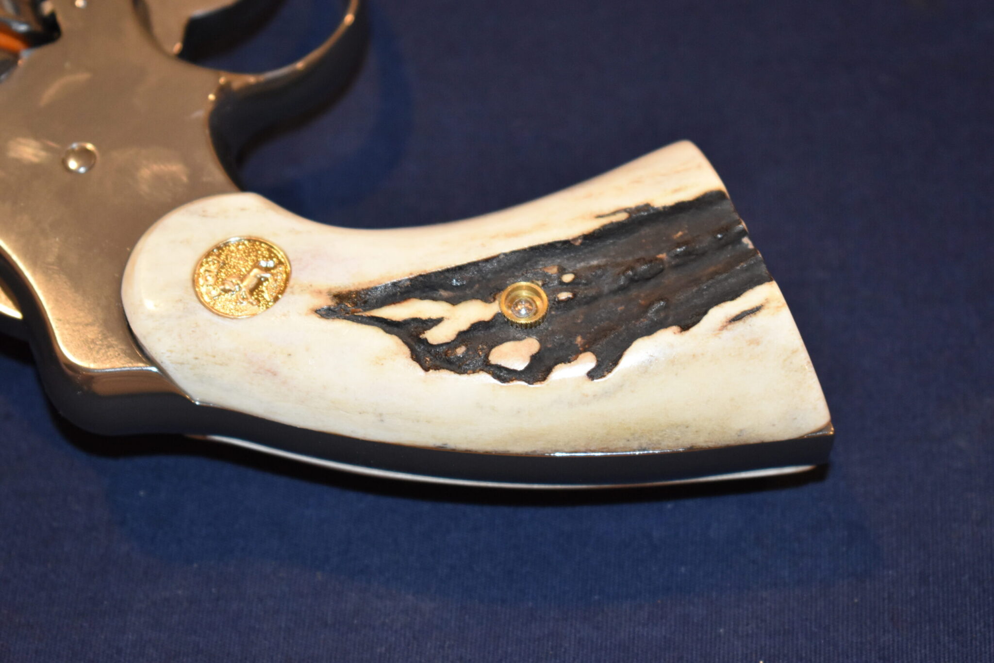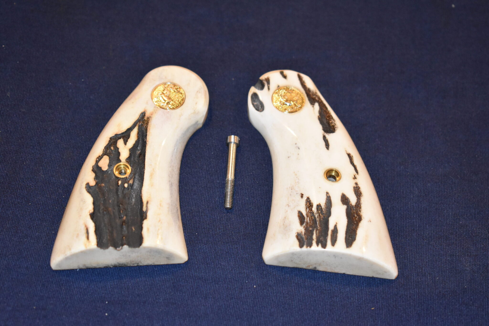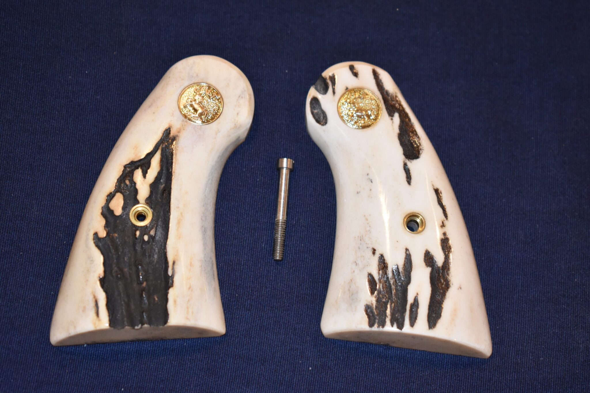 THIS IS A CUSTOM SET OF SAMBAR STAG GRIPS MADE TO FIT THE COLT PYTHON & OTHER I FRAME REVOLVERS SUCH AS THE OFFICER’S MODEL MATCH AND OFFICIAL POLICE. THESE ARE GENUINE SAMBAR STAG NOT IMITATION. THIOS SET HAS SOME NICE BARK COVERAGE AND HAVE COLT GOLD MEDALLIONS INSTALLED. THEY ARE SHOWN MOUNTED ON A NEWER 4″ STAINLESS PYTHON. TAKE A CLOSE LOOK AT THE PICTURES AS THEY DESCRIBE THE GRIPS BETTER THAN WORDS.