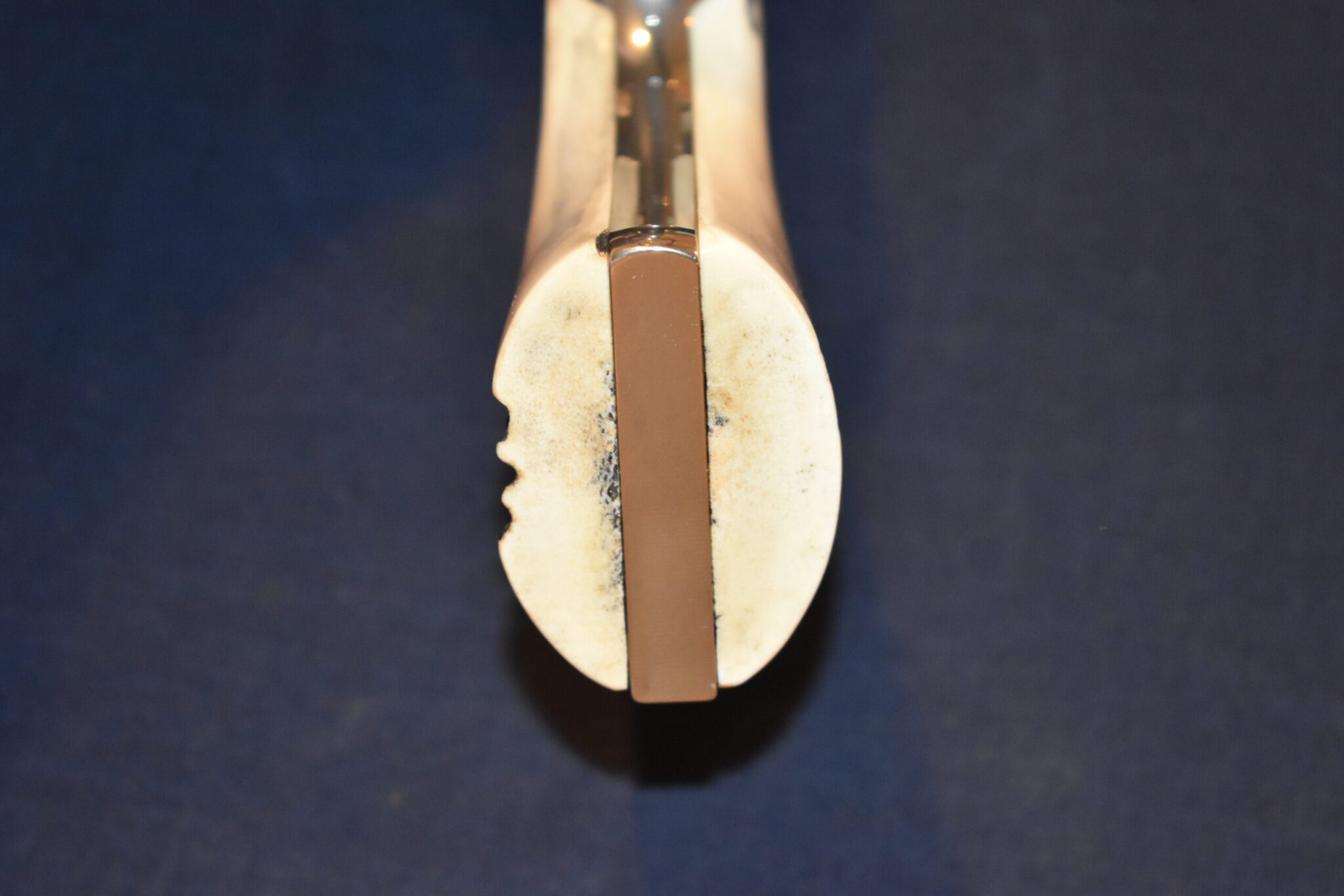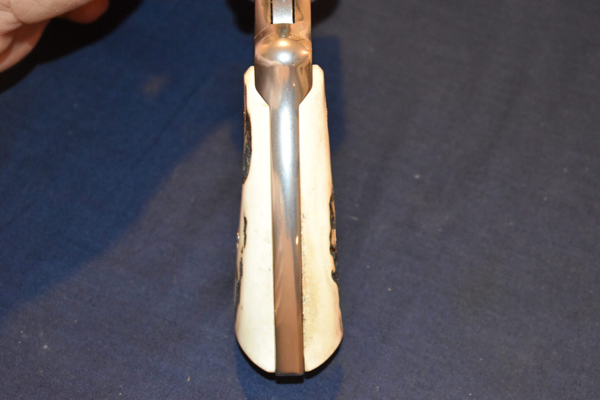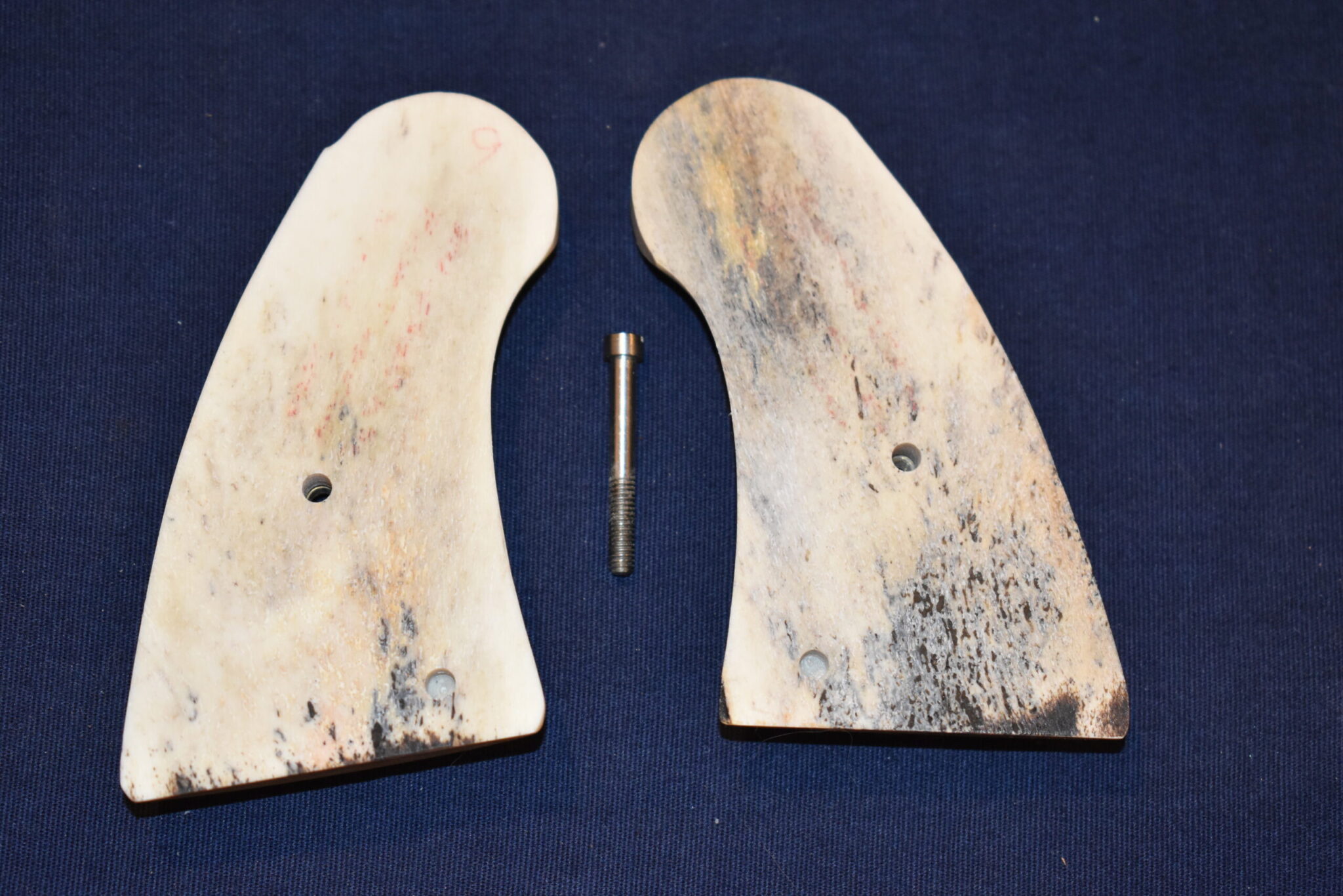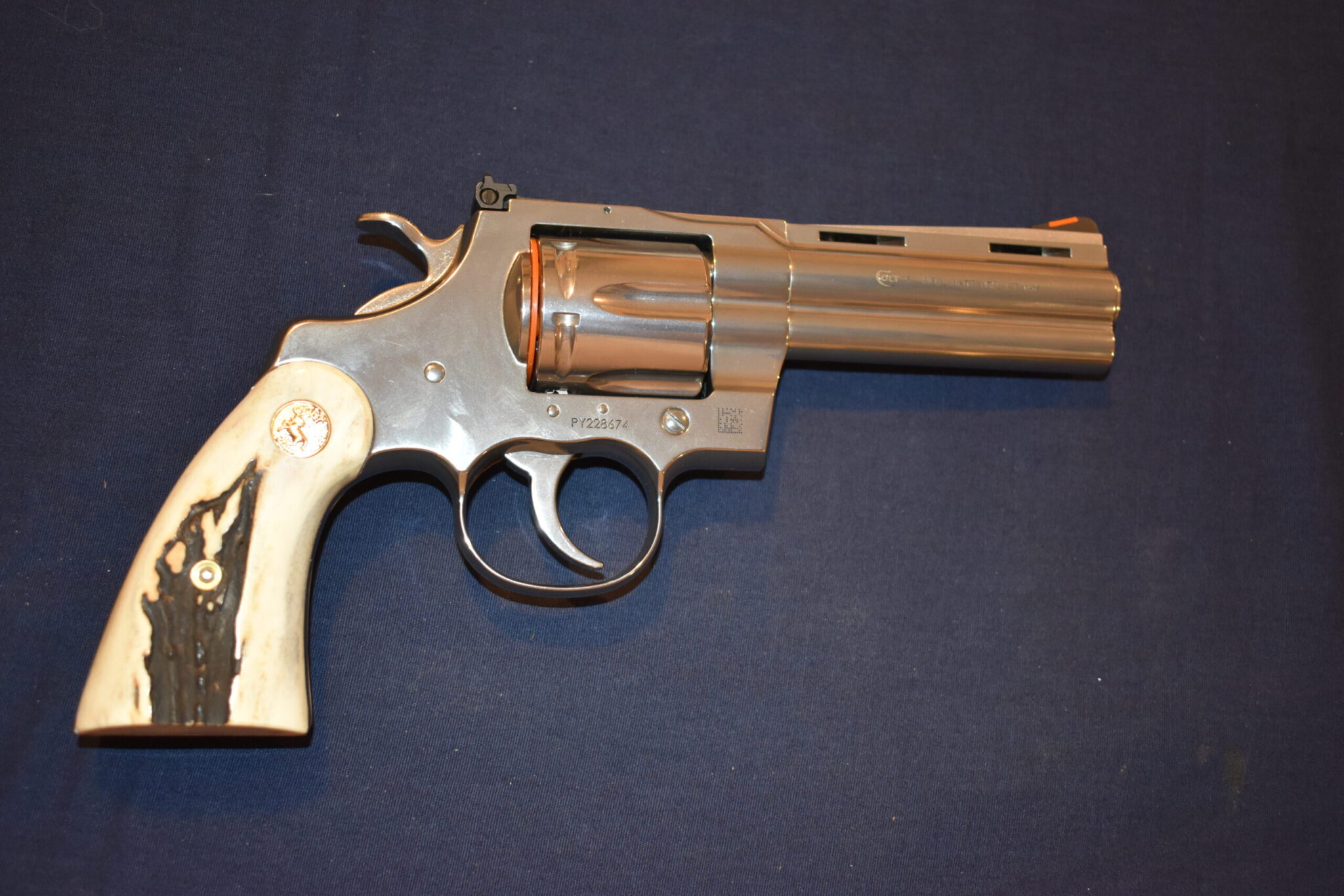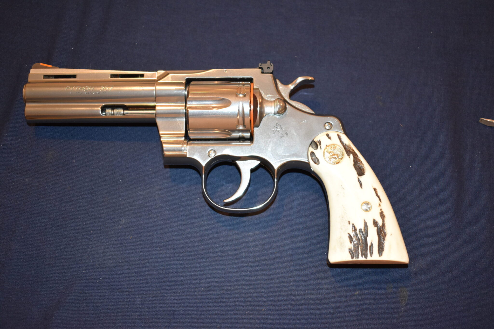 THIS IS A CUSTOM SET OF SAMBAR STAG GRIPS MADE TO FIT THE COLT PYTHON & OTHER I FRAME REVOLVERS SUCH AS THE OFFICER’S MODEL MATCH AND OFFICIAL POLICE. THESE ARE GENUINE SAMBAR STAG NOT IMITATION. THIOS SET HAS SOME NICE BARK COVERAGE AND HAVE COLT GOLD MEDALLIONS INSTALLED. THEY ARE SHOWN MOUNTED ON A NEWER 4″ STAINLESS PYTHON. TAKE A CLOSE LOOK AT THE PICTURES AS THEY DESCRIBE THE GRIPS BETTER THAN WORDS.