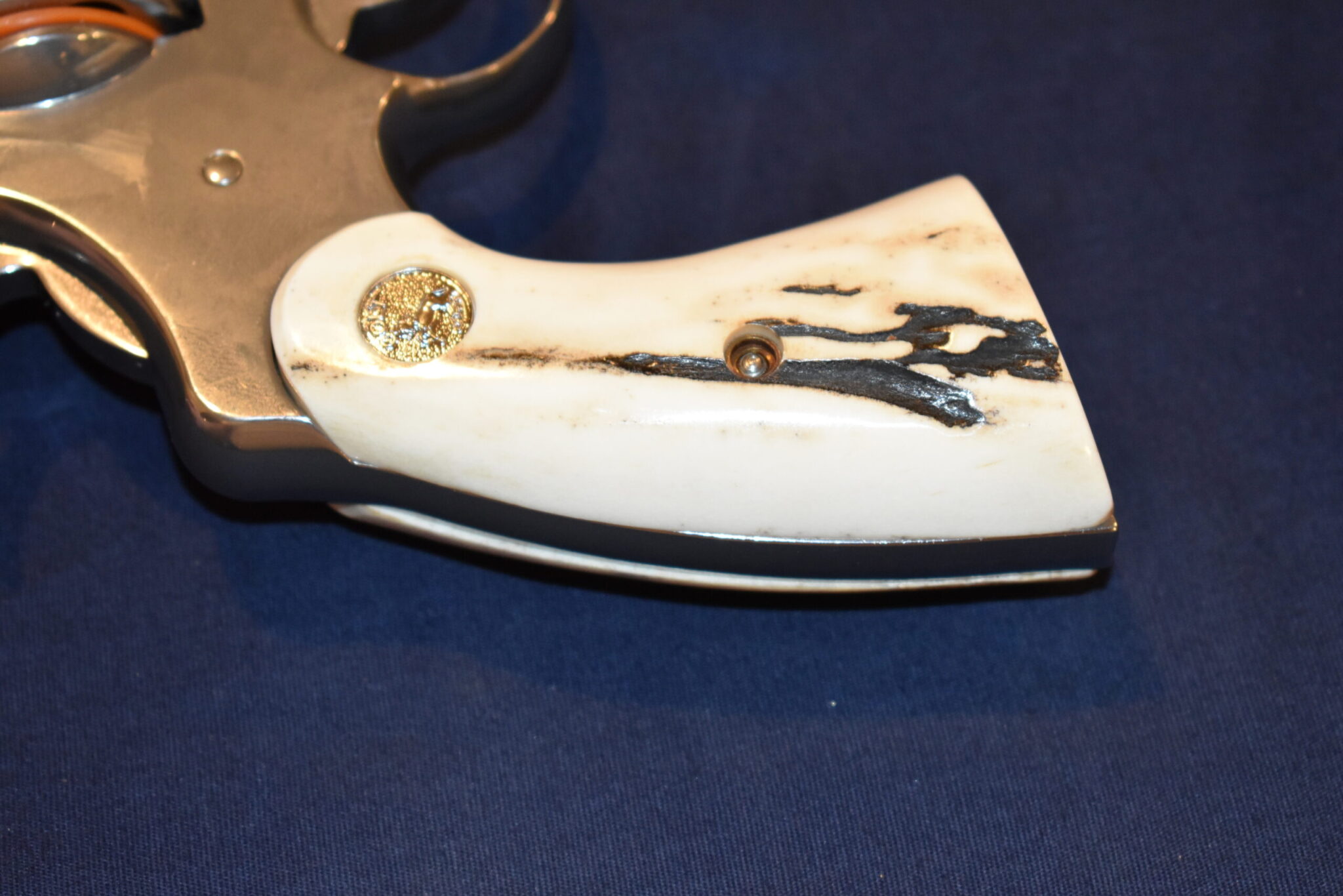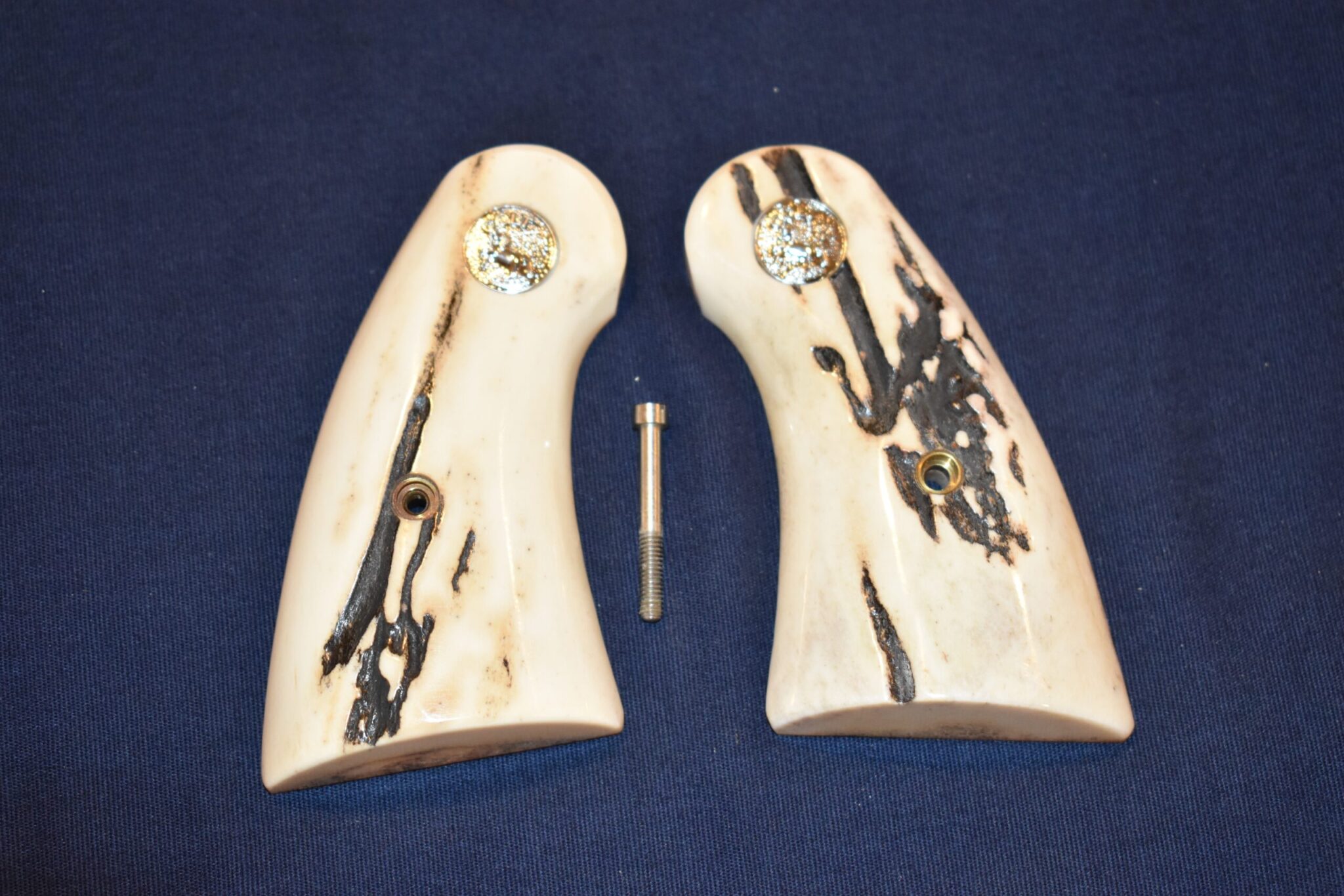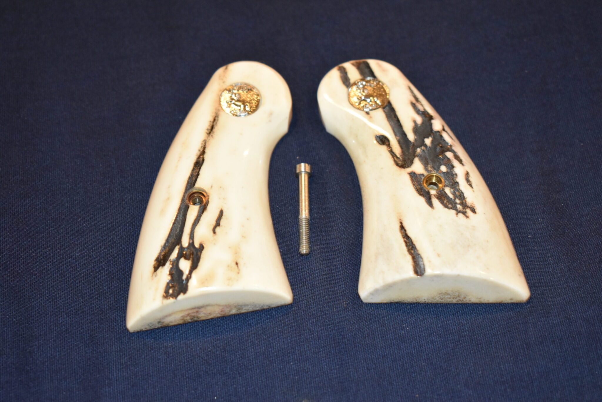 THIS IS A CUSTOM SET OF SAMBAR STAG GRIPS MADE TO FIT THE COLT PYTHON & OTHER I FRAME REVOLVERS SUCH AS THE OFFICER’S MODEL MATCH AND OFFICIAL POLICE. THESE ARE GENUINE SAMBAR STAG NOT IMITATION. THIOS SET HAS SOME NICE BARK COVERAGE AND HAVE COLT SILVER MEDALLIONS INSTALLED. THEY ARE SHOWN MOUNTED ON A NEWER 4″ STAINLESS PYTHON. TAKE A CLOSE LOOK AT THE PICTURES AS THEY DESCRIBE THE GRIPS BETTER THAN WORDS.