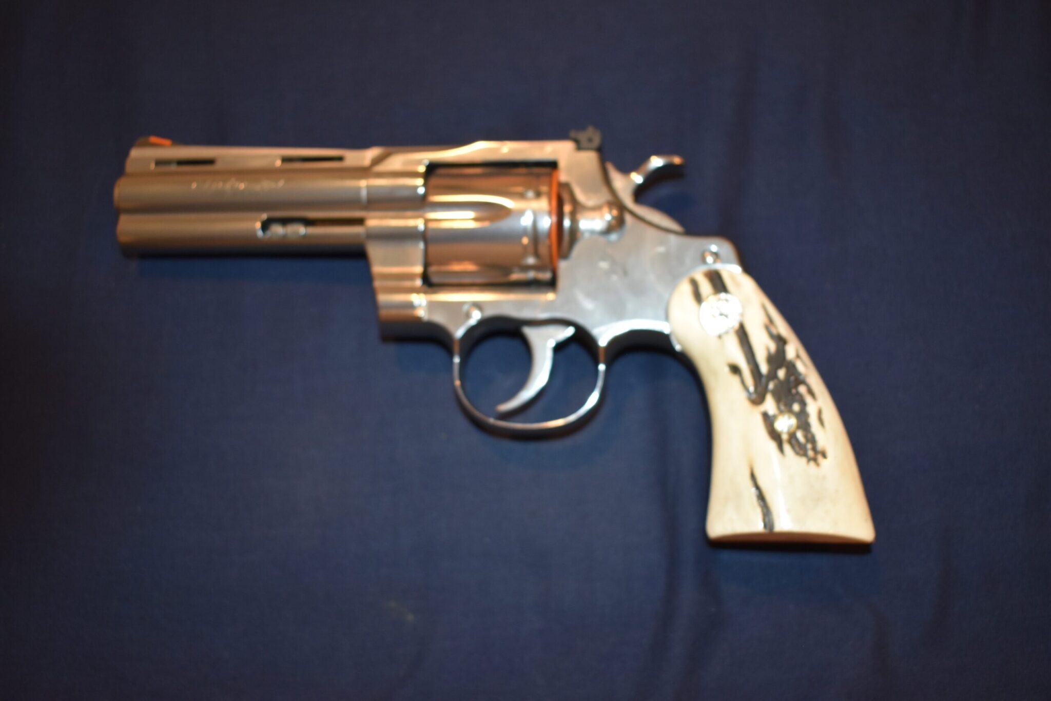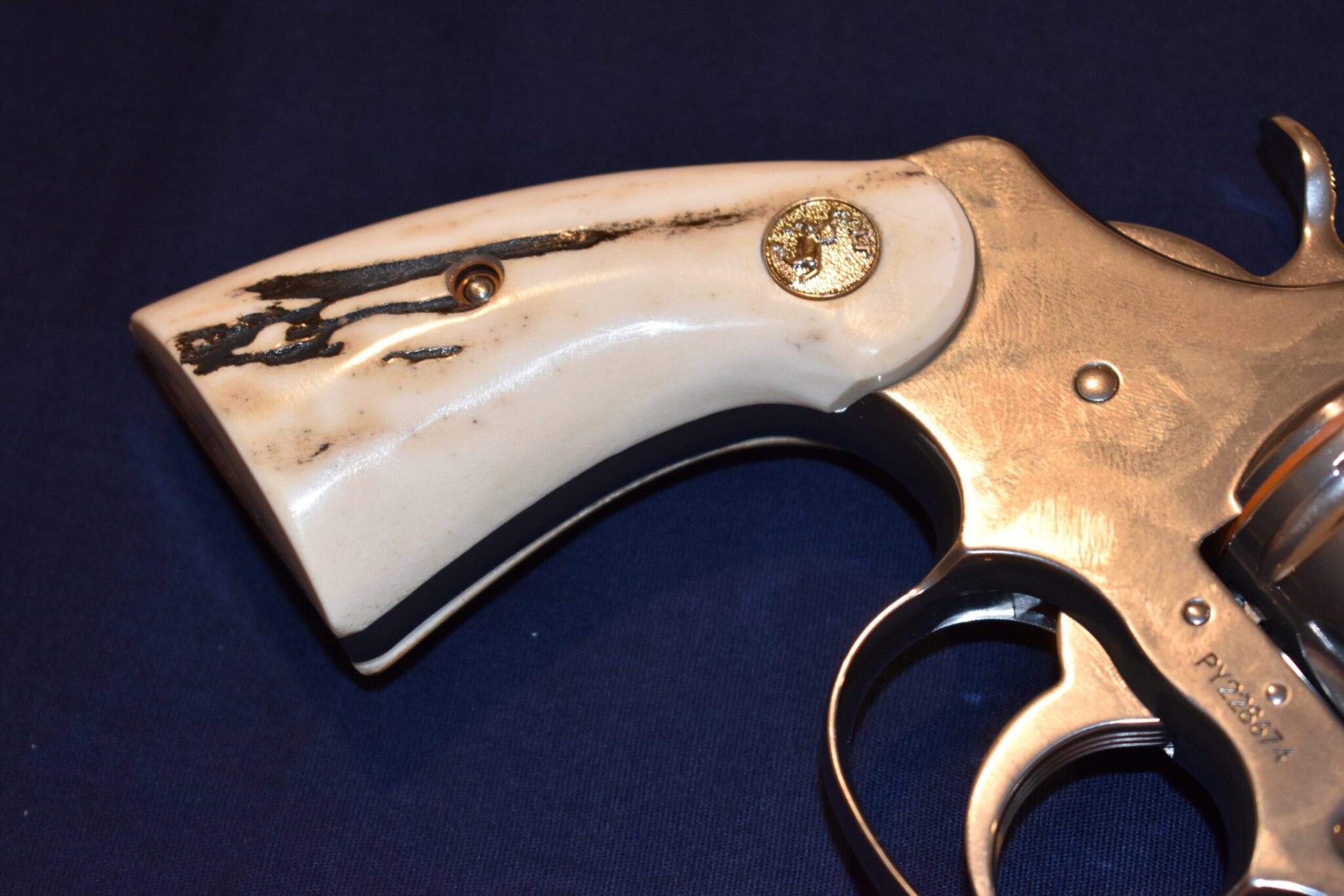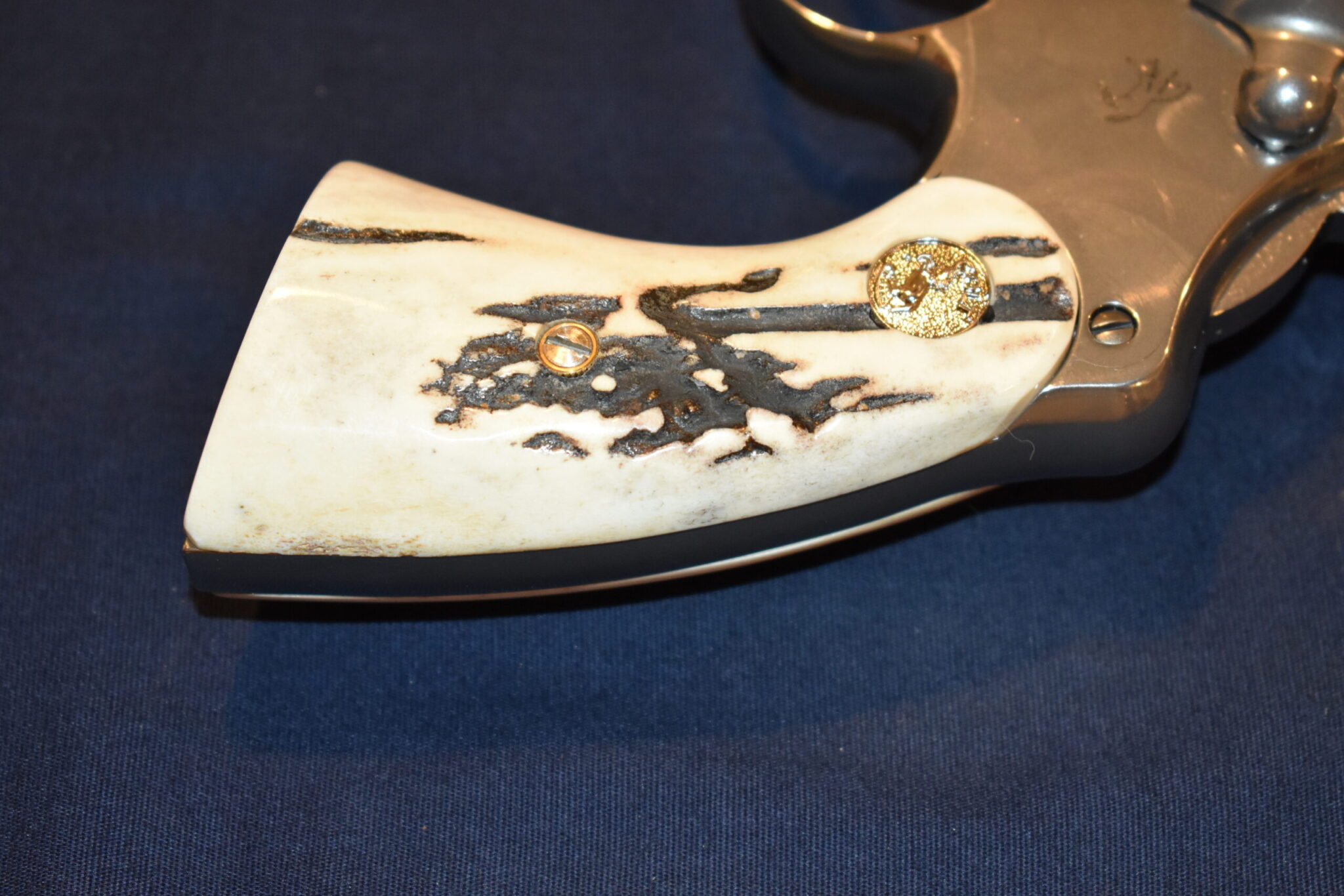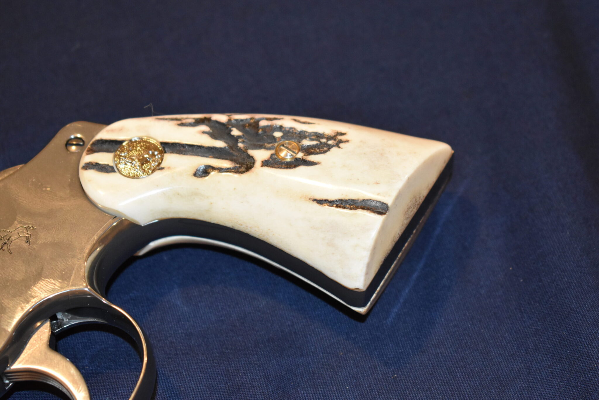 THIS IS A CUSTOM SET OF SAMBAR STAG GRIPS MADE TO FIT THE COLT PYTHON & OTHER I FRAME REVOLVERS SUCH AS THE OFFICER’S MODEL MATCH AND OFFICIAL POLICE. THESE ARE GENUINE SAMBAR STAG NOT IMITATION. THIOS SET HAS SOME NICE BARK COVERAGE AND HAVE COLT SILVER MEDALLIONS INSTALLED. THEY ARE SHOWN MOUNTED ON A NEWER 4″ STAINLESS PYTHON. TAKE A CLOSE LOOK AT THE PICTURES AS THEY DESCRIBE THE GRIPS BETTER THAN WORDS.