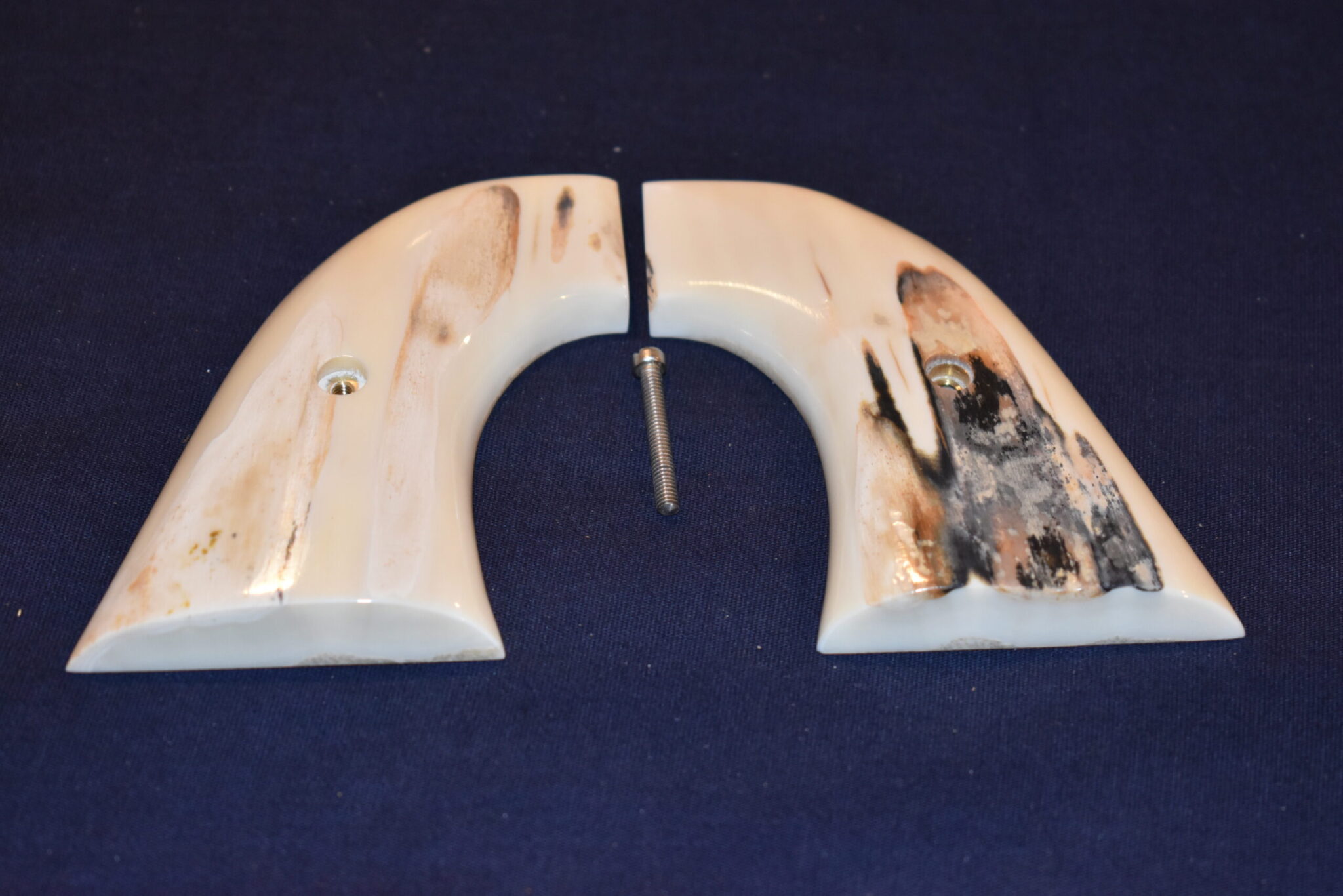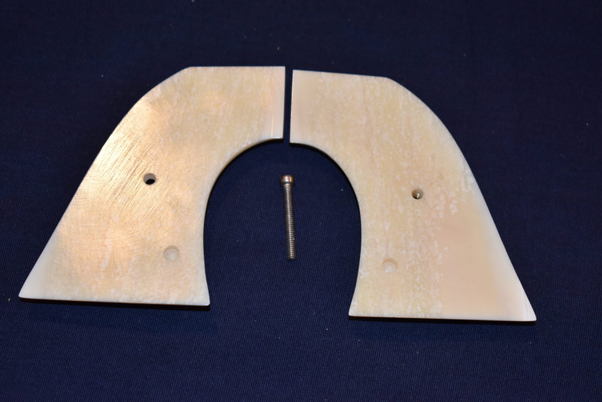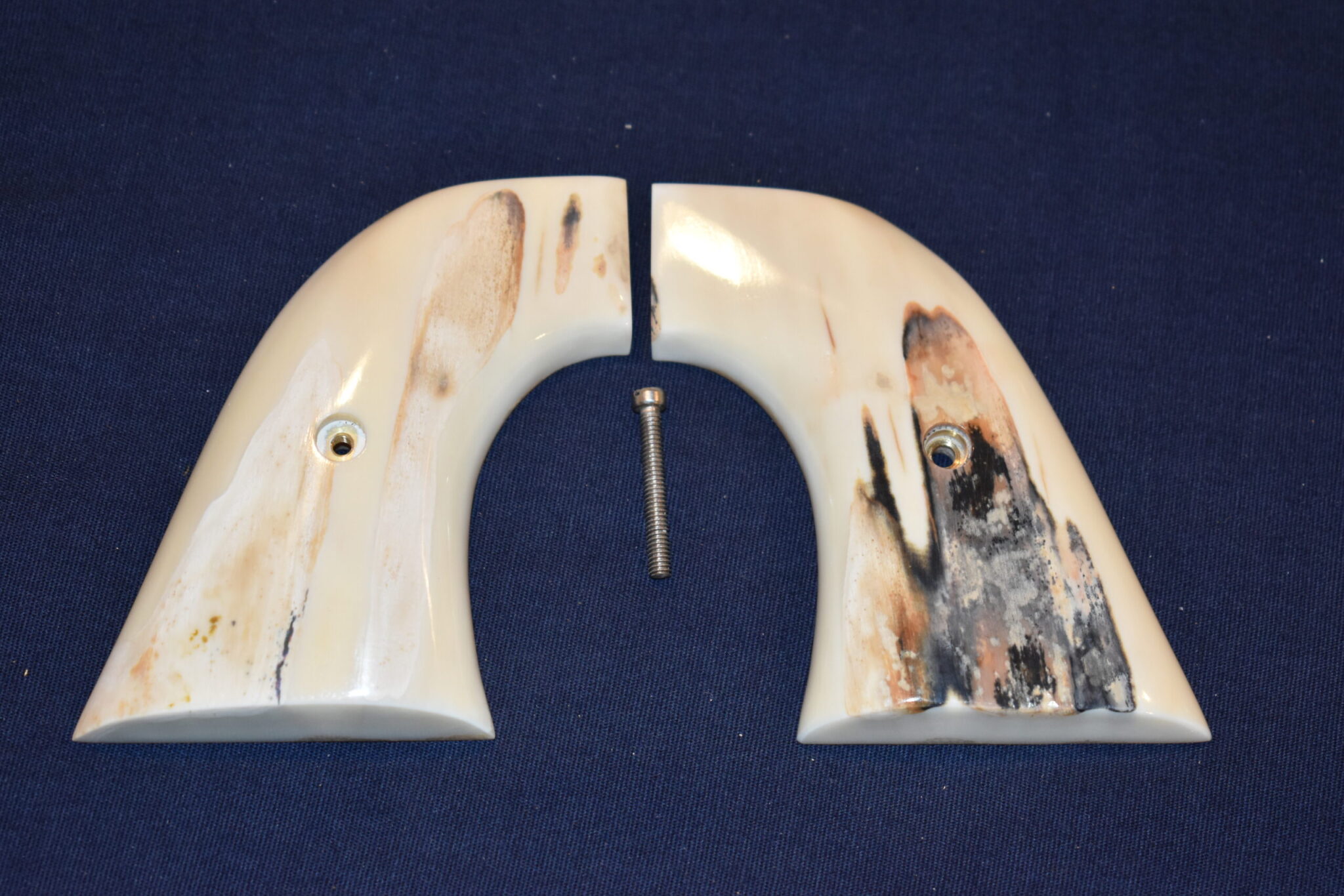 HERE IS A CUSTOM SET OF PREMIUM GRADE FOSSILIZED WALRUS IVORY GRIPS THAT FIT THE THE COLT 2nd or 3rd GENERATION SINGLE ACTION ARMY. THESE ARE REAL FOSSILIZE WALRUS IVORY NOT IMITATION. THIS SET HAS A CREAMY YELLOW COLOR WITH SOME BEAUTIFUL OVERLAY COLORS. THEY ARE SHOWN MOUNTED ON A 4 3/4" COLT S.A.A.. Â AS WITH ALL NATURAL MATERIAL THERE MAY BE SOME SLIGHT FITTING REQUIRED. TAKE A CLOSE LOOK AT THE PICTURES AS THEY DESCRIBE THE GRIPS BETTER THAN WORDS. SHIPPING WILL BE $8.50 PRIORITY MAIL.
