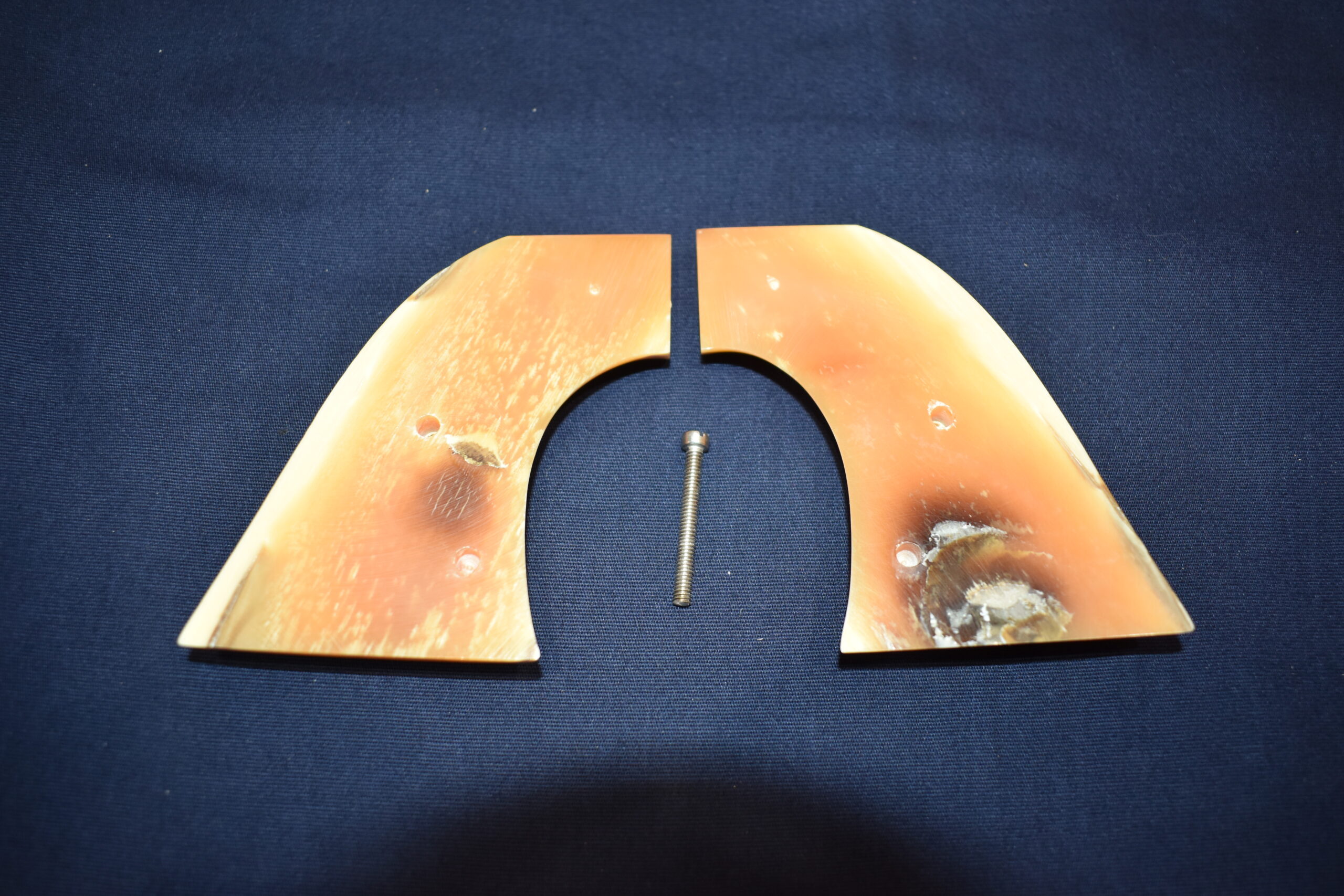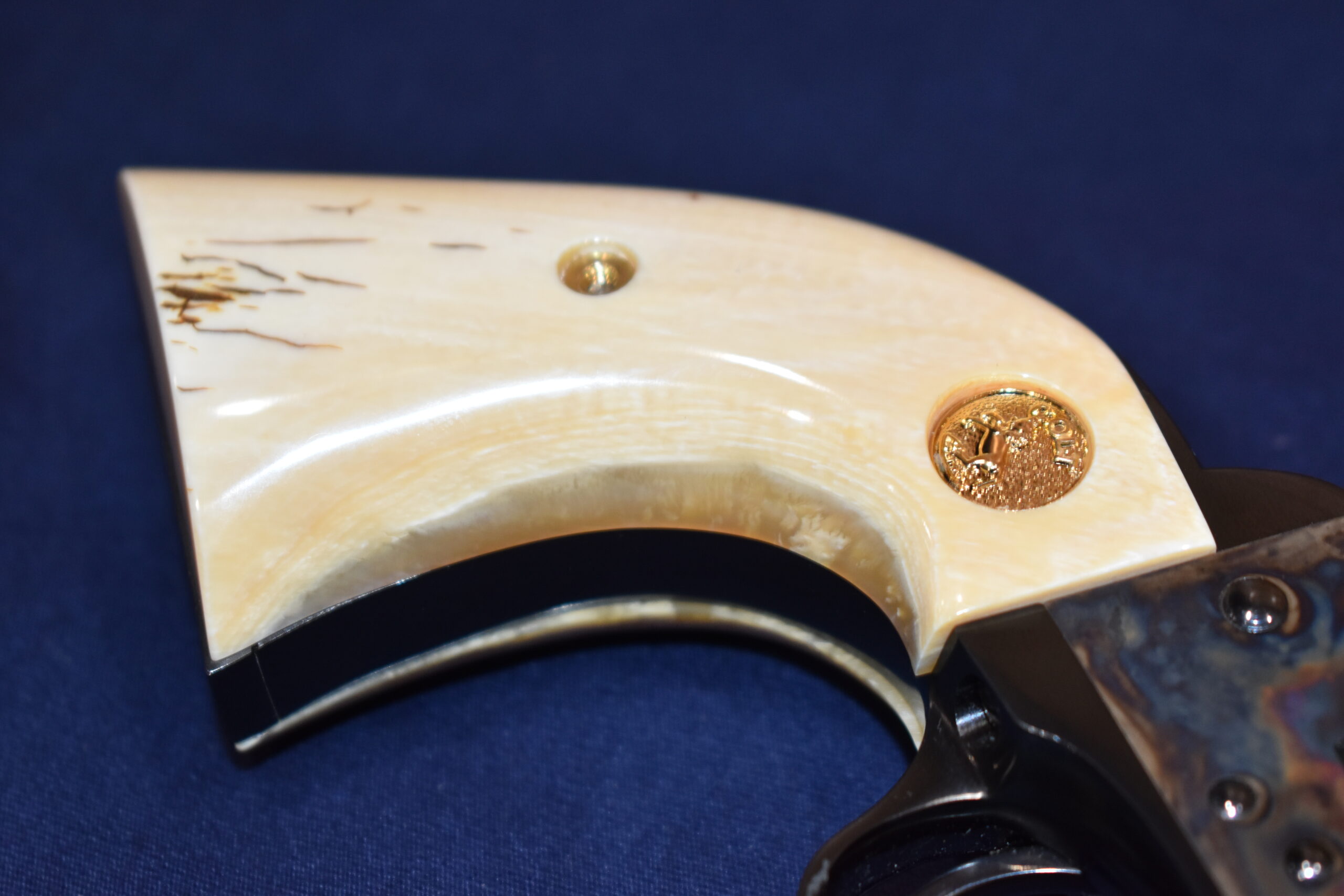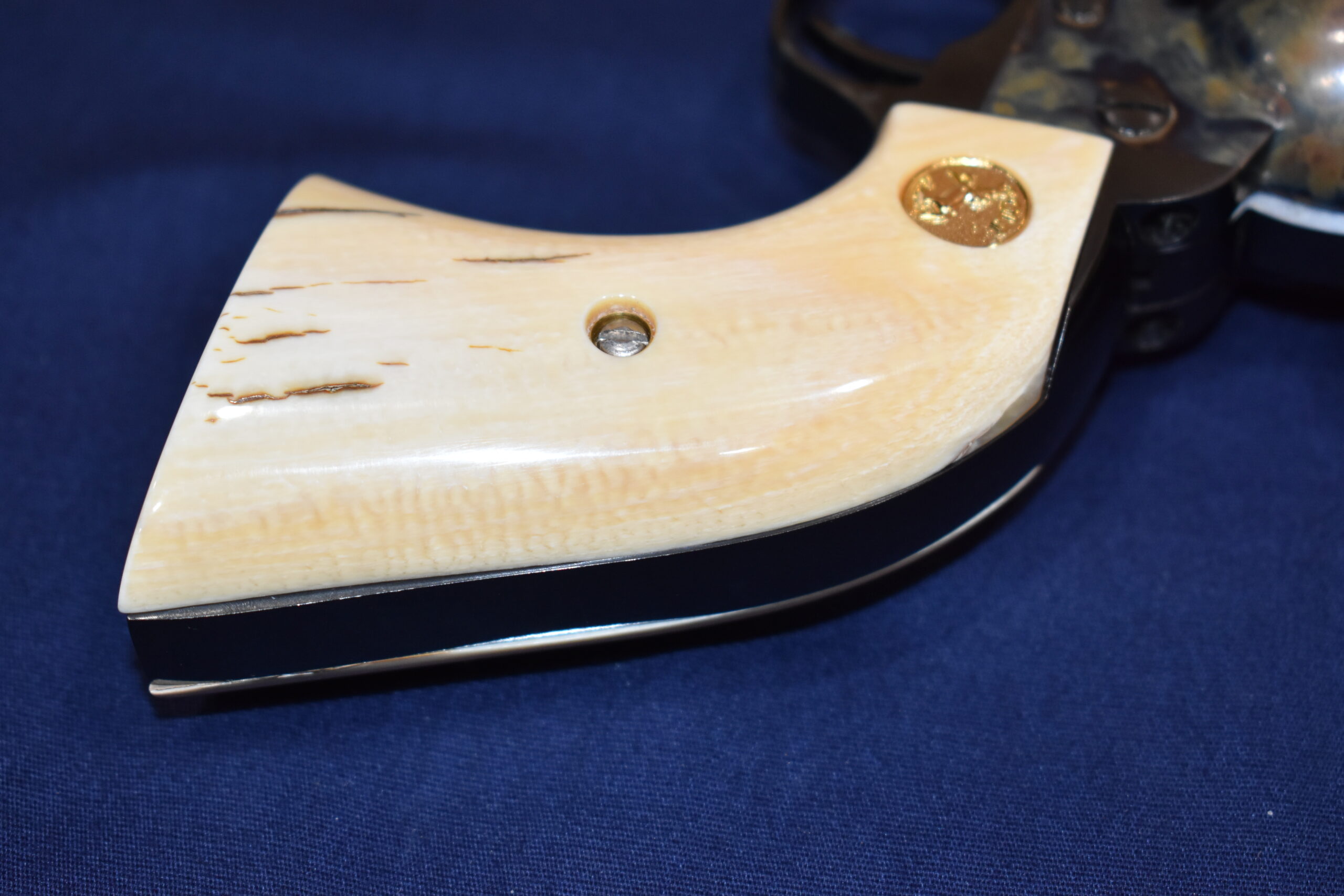 THIS IS A CUSTOM SET OF MAMMOTH IVORY MADE TO FIT THE COLT S.A.A. REVOLVERS. THESE ARE GENUINE MAMMOTH IVORY NOT IMITATION. AS WITH ALL S.A.A. GRIPS THERE MAY BE SOME SLIGHT FITTING INVOLVED. THIS SET IS ABSOLUTELY BEAUTIFUL!!! THEY HAVE A CREAMY YELLOW COLOR BASE WITH SOME DARK CRACKLE LINES. THEY HAVE GOLD COLT MEDALLIONS. THEY ARE SHOWN MOUNTED ON AN UNFIRED 4 3/4″ SINGLE ACTION ARMY. TAKE A CLOSE LOOK AT THE PICTURES AS THEY DESCRIBE THE GRIPS BETTER THAN WORDS.