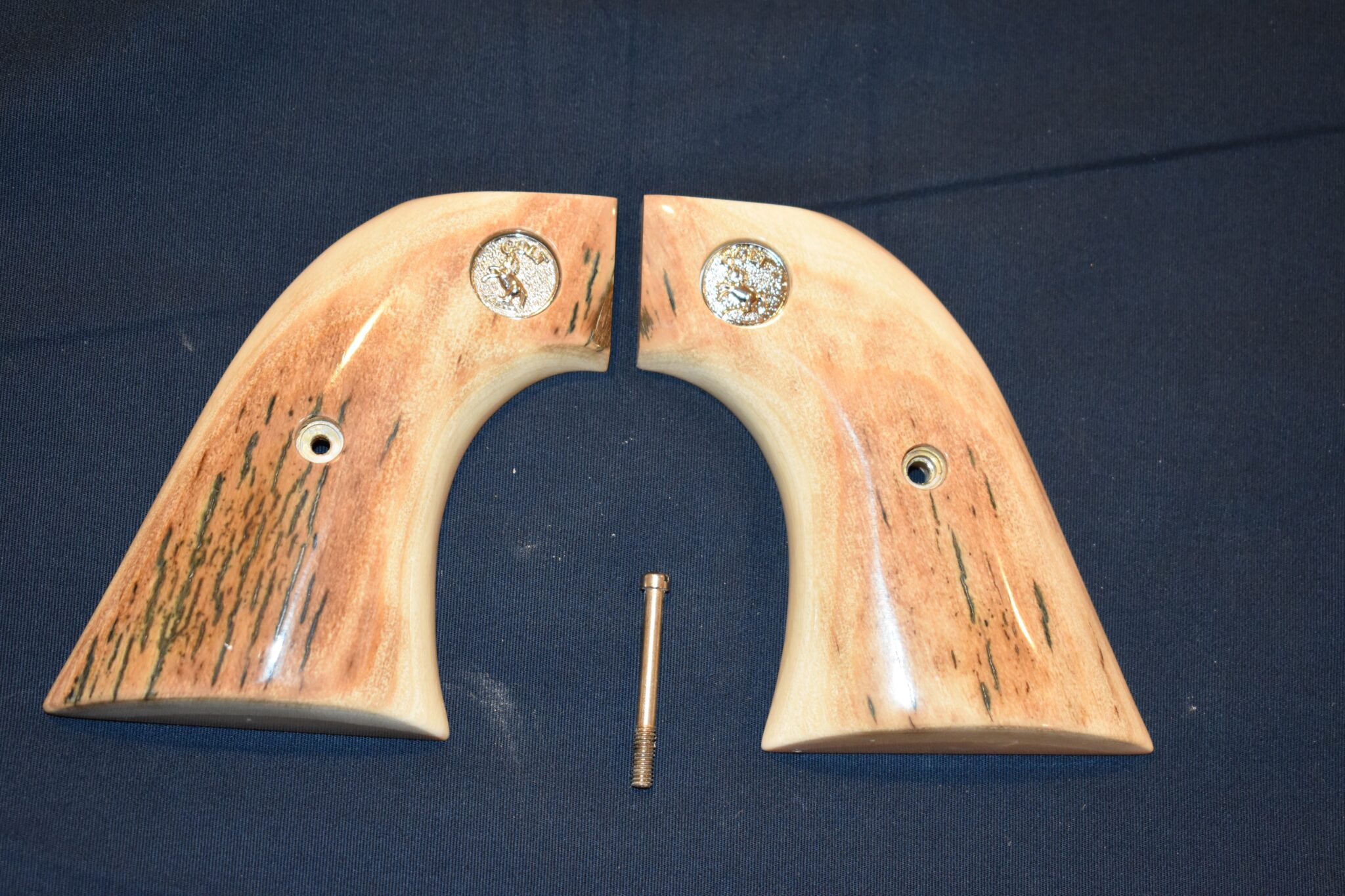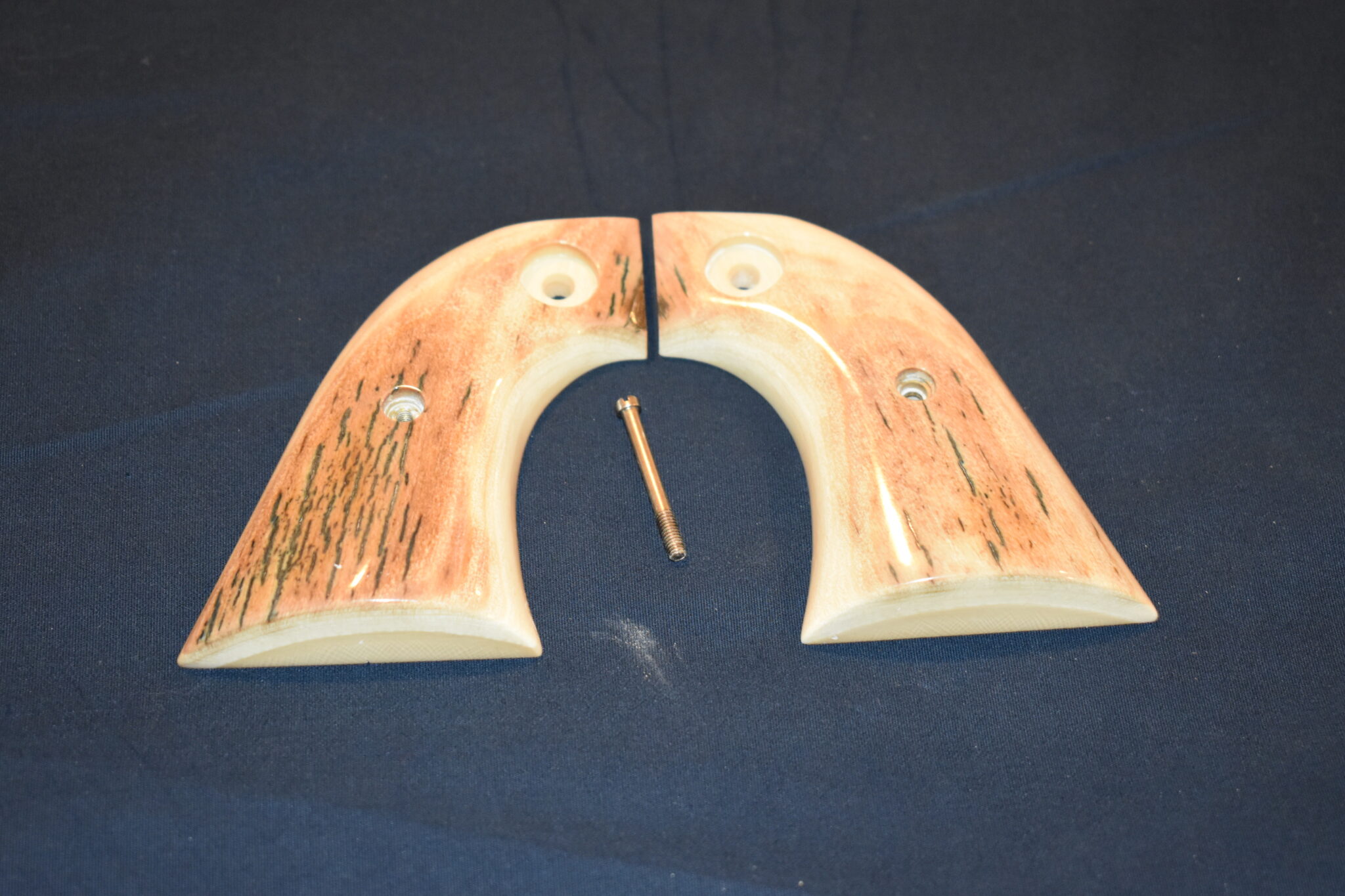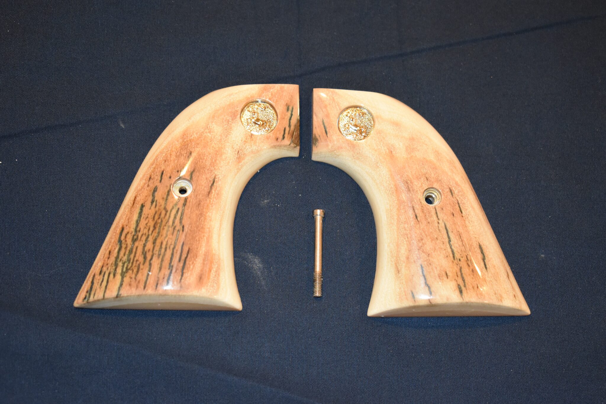 THIS IS A CUSTOM SET OF MAMMOTH IVORY MADE TO FIT THE COLT S.A.A. REVOLVERS. THESE ARE GENUINE MAMMOTH IVORY NOT IMITATION. AS WITH ALL S.A.A. GRIPS THERE MAY BE SOME SLIGHT FITTING INVOLVED. THIS SET IS ABSOLUTELY BEAUTIFUL!!! THEY HAVE A CREAMY YELLOW COLOR BASE WITH SOME DARKER OVERLAYS. THEY HAVE BEEN DRILLED FOR MEDALLIONS AND YOU CAN HAVE YOUR CHOICE OF GOLD OR SILVER. THEY ARE SHOWN MOUNTED ON AN UNFIRED 4 3/4″ SINGLE ACTION ARMY. TAKE A CLOSE LOOK AT THE PICTURES AS THEY DESCRIBE THE GRIPS BETTER THAN WORDS.