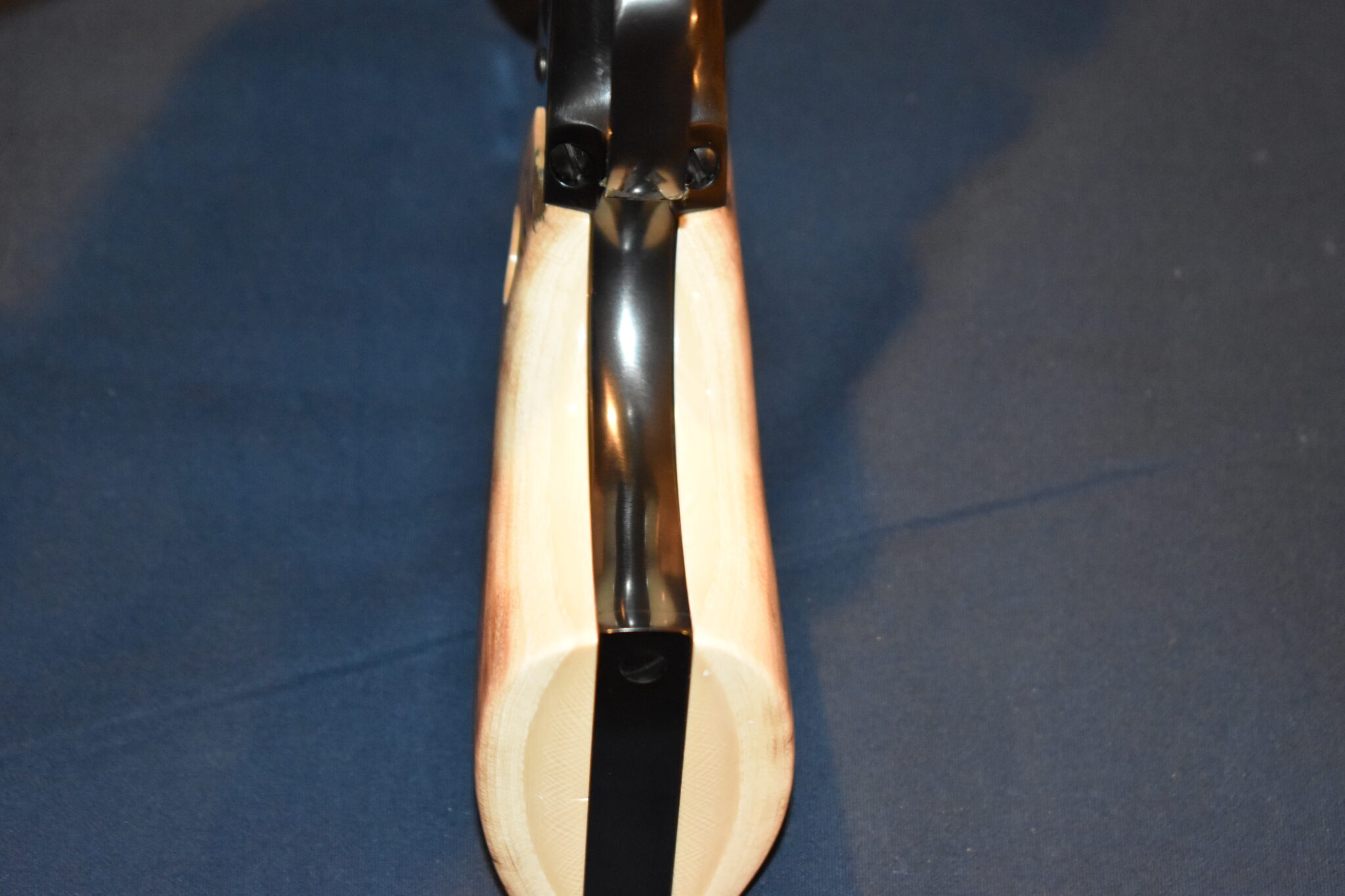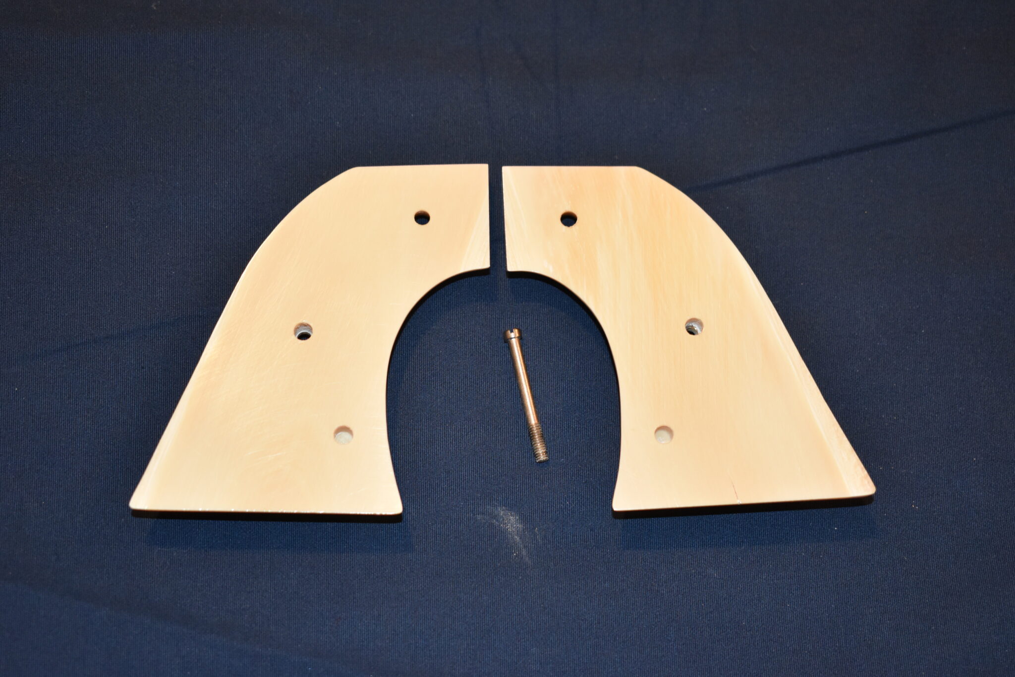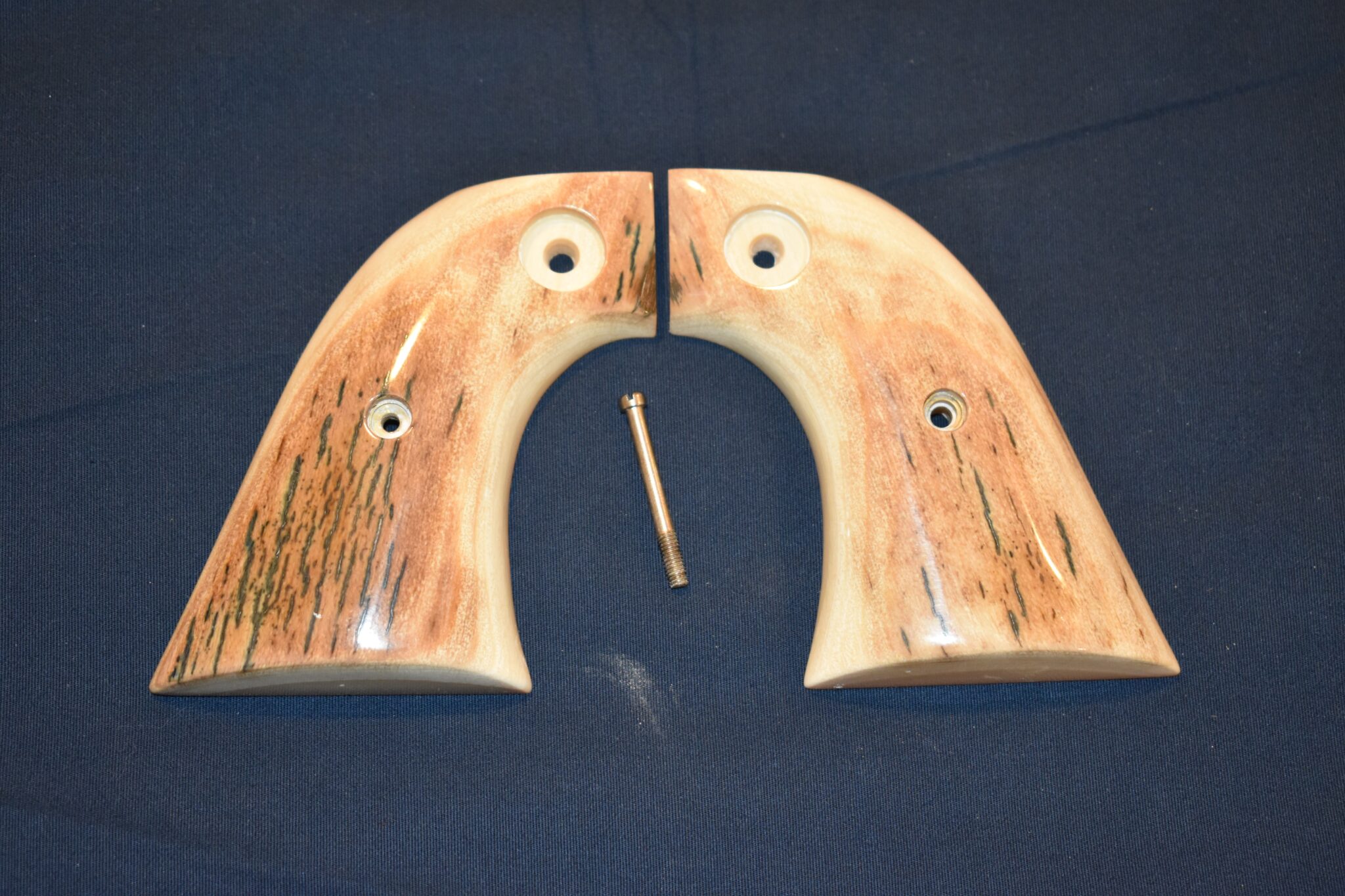 THIS IS A CUSTOM SET OF MAMMOTH IVORY MADE TO FIT THE COLT S.A.A. REVOLVERS. THESE ARE GENUINE MAMMOTH IVORY NOT IMITATION. AS WITH ALL S.A.A. GRIPS THERE MAY BE SOME SLIGHT FITTING INVOLVED. THIS SET IS ABSOLUTELY BEAUTIFUL!!! THEY HAVE A CREAMY YELLOW COLOR BASE WITH SOME DARKER OVERLAYS. THEY HAVE BEEN DRILLED FOR MEDALLIONS AND YOU CAN HAVE YOUR CHOICE OF GOLD OR SILVER. THEY ARE SHOWN MOUNTED ON AN UNFIRED 4 3/4″ SINGLE ACTION ARMY. TAKE A CLOSE LOOK AT THE PICTURES AS THEY DESCRIBE THE GRIPS BETTER THAN WORDS.