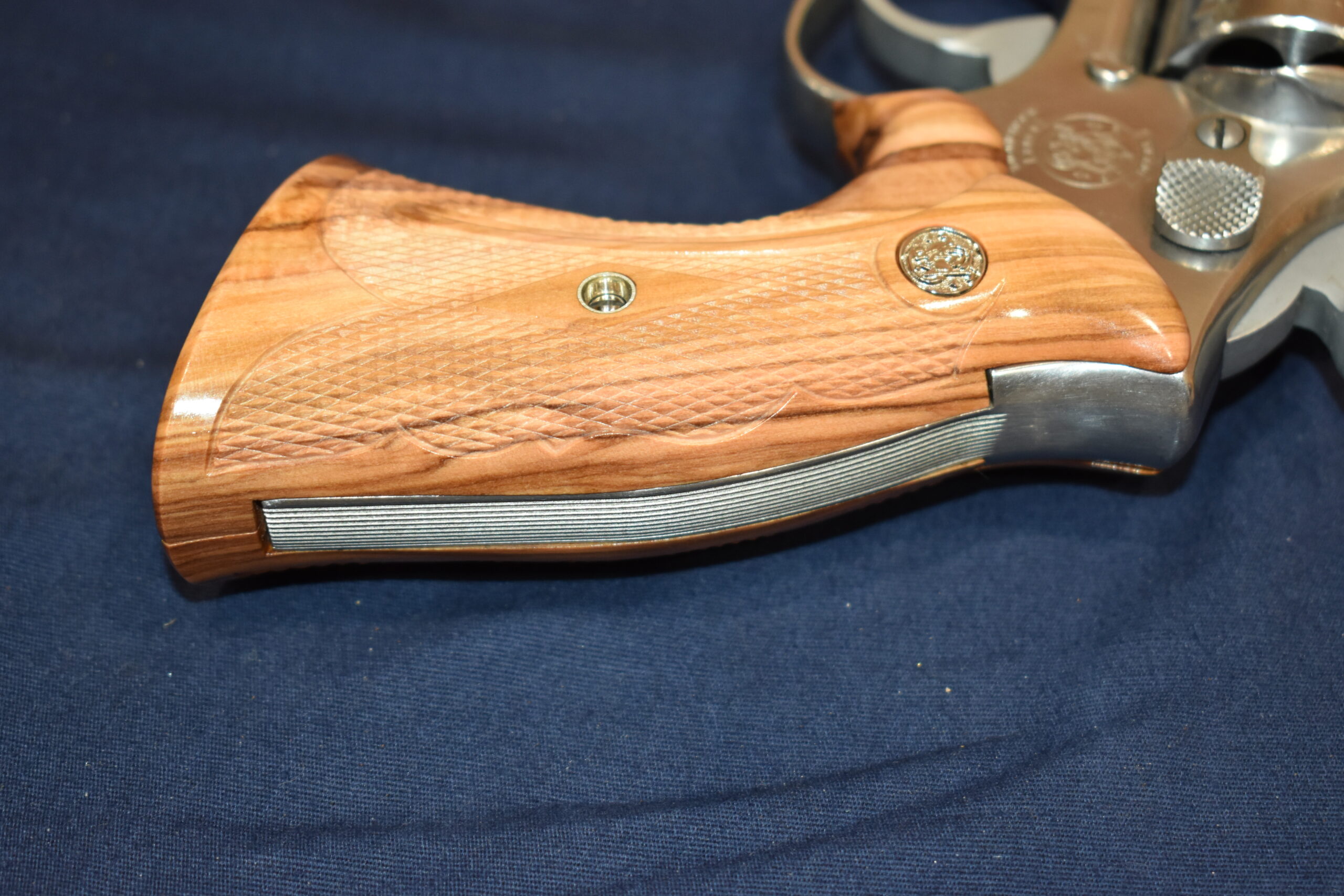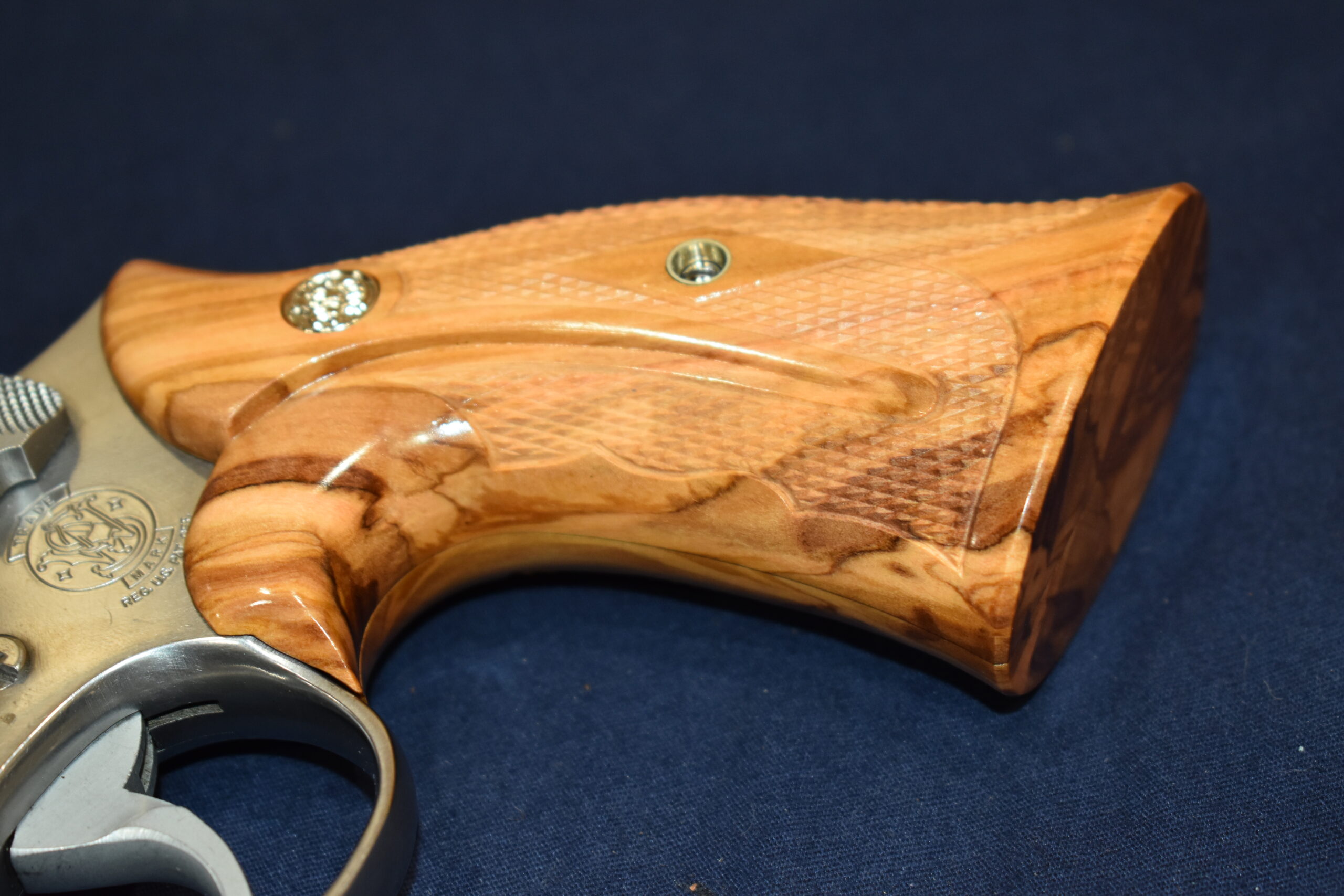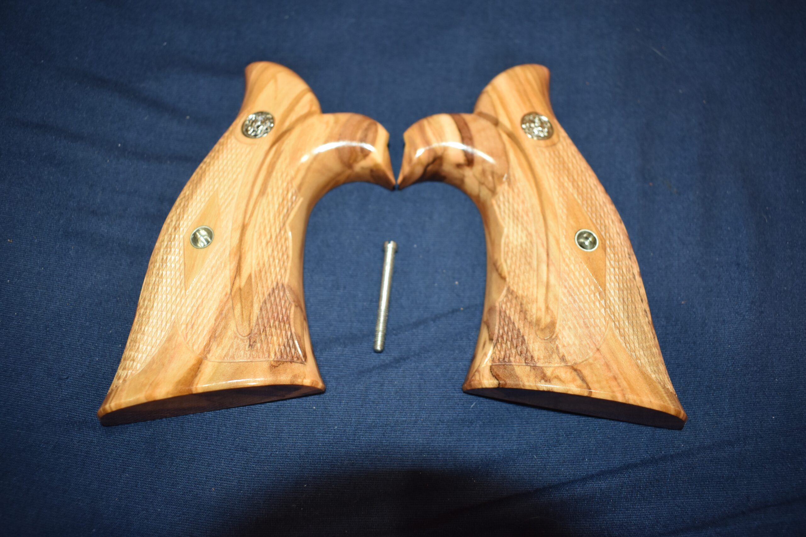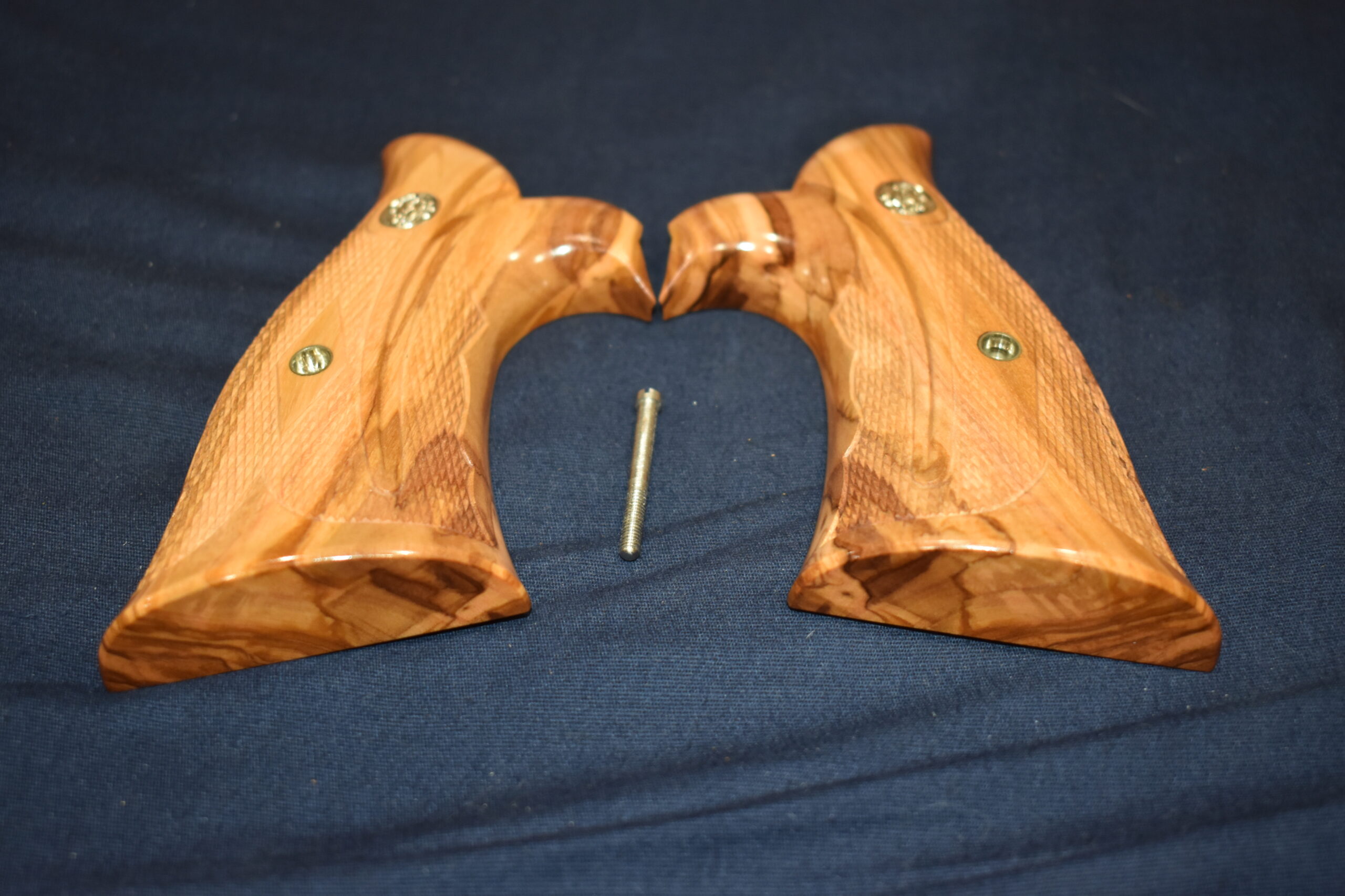 THIS IS A CUSTOM SET OF GRIPS MADE BY FAMOUS GRIP MAKER KEITH BROWN. THIS SET IS MADE FROM OLIVE WOOD. THEY HAVE A VERY UNIQUE PATTERN. THESE ARE MADE TO FIT THE SMITH & WESSON K FRAME SQUARE BUTT REVOLVERS. THEY WILL NOT FIT THE ROUND BUTT REVOLVERS. THIS SET HAS KEITH’S EXPEDITION GRADE FINISH. I AM FORTUNATE ENOUGH TO OWN SEVERAL SETS OF KEITH’S GRIPS AND EACH SET IS EXQUISITE. THE THE DETAIL AND CRAFTSMANSHIP THAT GOES INTO EACH SET ALWAYS AMAZES ME. THEY ARE SHOWN MOUNTED ON A MODEL 66. TAKE A CLOSE LOOK AT THE PICTURES AS THEY DESCRIBE THE GRIPS BETTER THAN WORDS. THE FLASH MAKES THE GRIPS LOOK A LITTLE LIGHTER THAN WHAT THEY ACTUALLY ARE.
