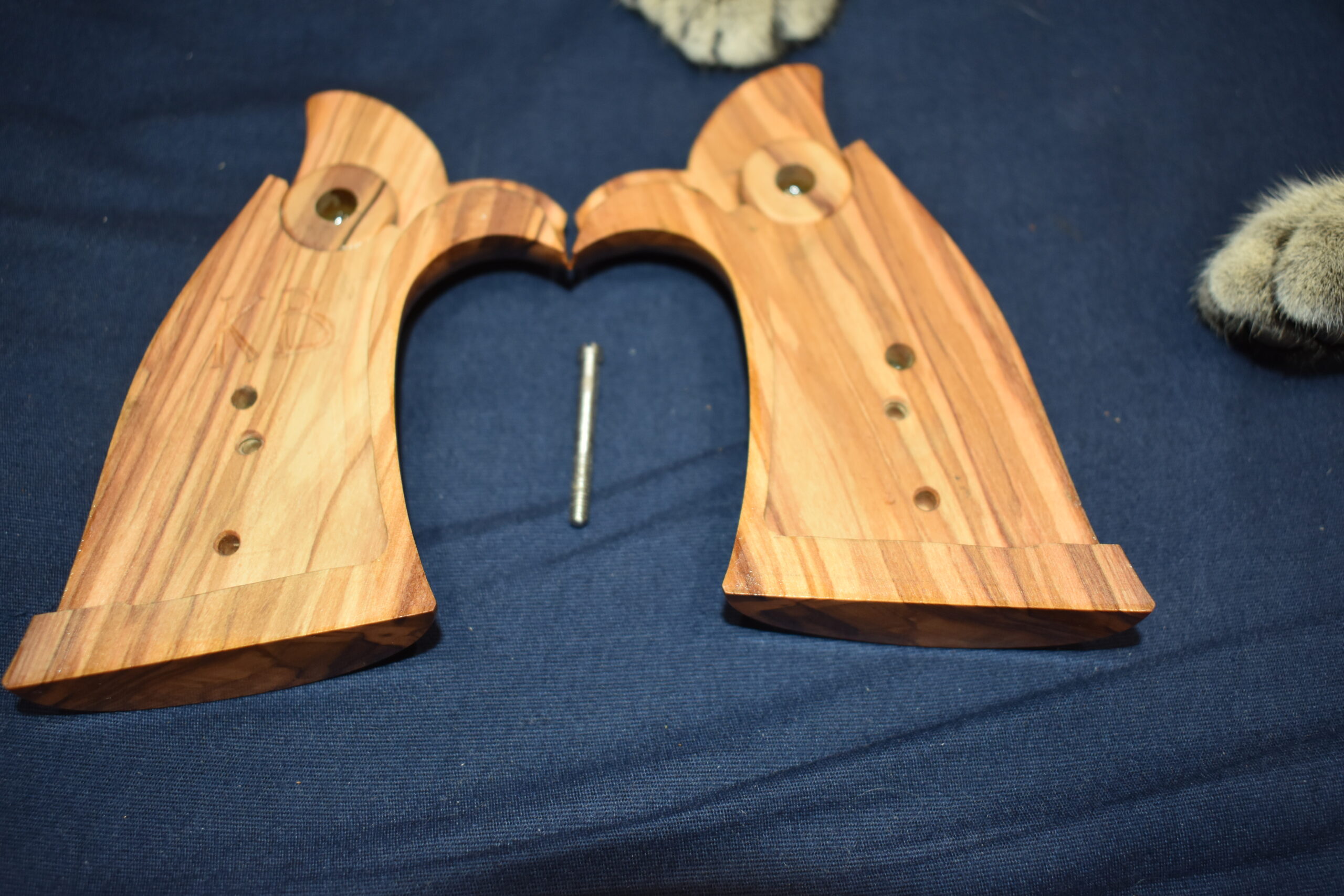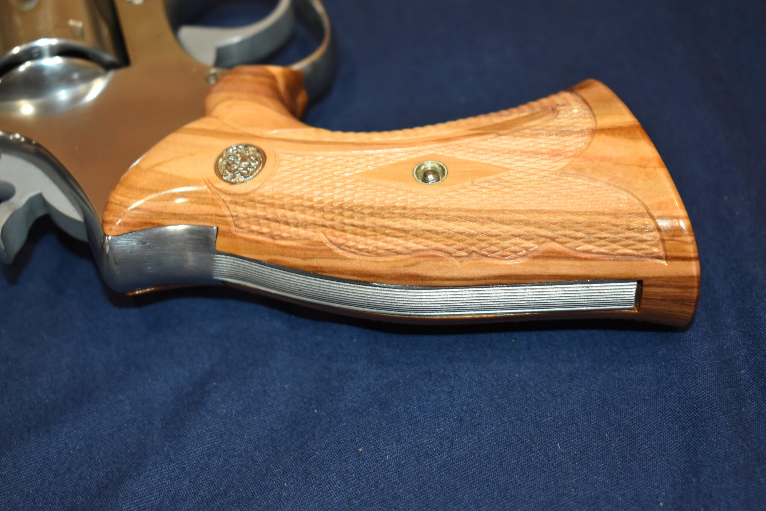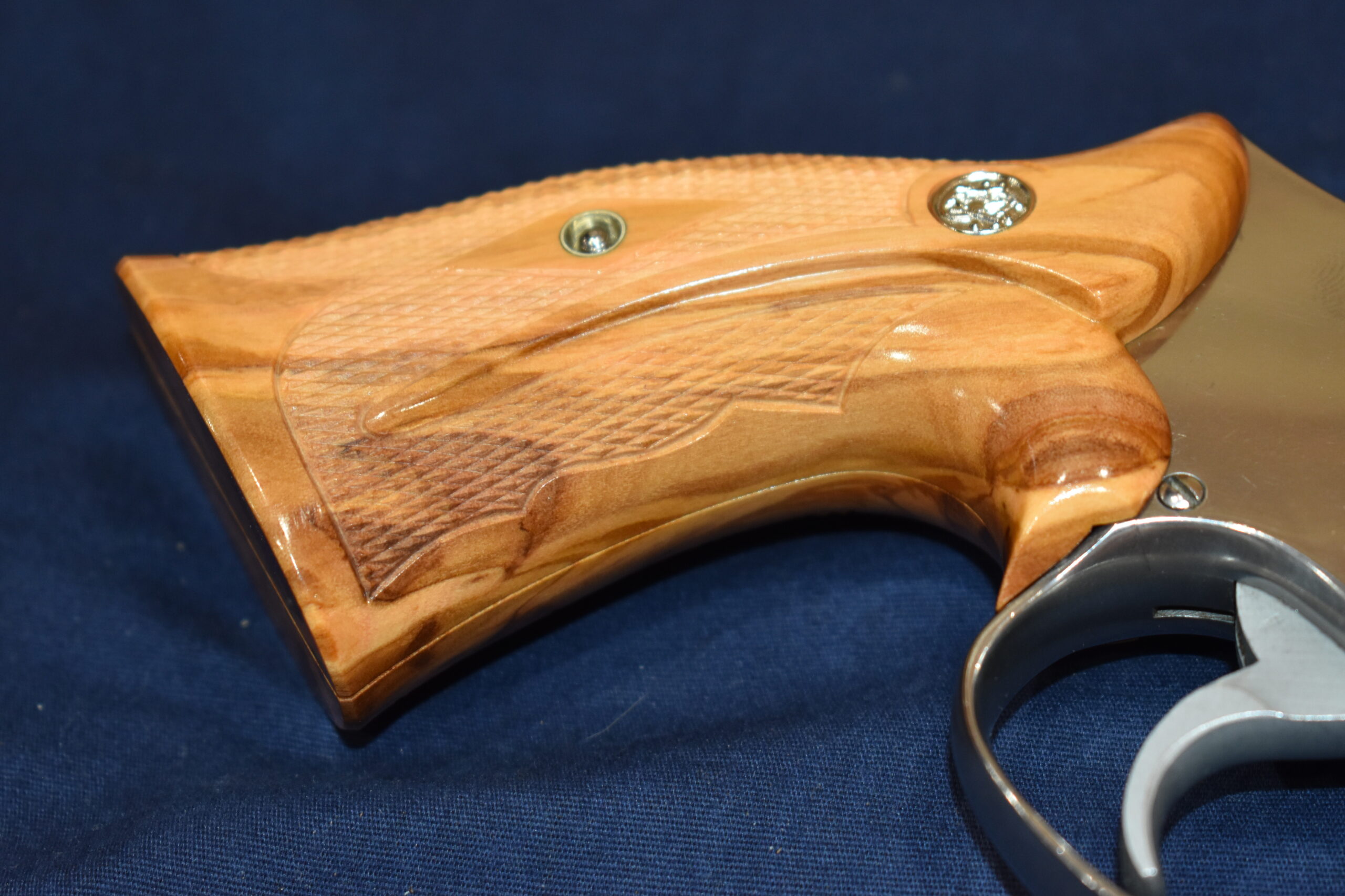 THIS IS A CUSTOM SET OF GRIPS MADE BY FAMOUS GRIP MAKER KEITH BROWN. THIS SET IS MADE FROM OLIVE WOOD. THEY HAVE A VERY UNIQUE PATTERN. THESE ARE MADE TO FIT THE SMITH & WESSON K FRAME SQUARE BUTT REVOLVERS. THEY WILL NOT FIT THE ROUND BUTT REVOLVERS. THIS SET HAS KEITH’S EXPEDITION GRADE FINISH. I AM FORTUNATE ENOUGH TO OWN SEVERAL SETS OF KEITH’S GRIPS AND EACH SET IS EXQUISITE. THE THE DETAIL AND CRAFTSMANSHIP THAT GOES INTO EACH SET ALWAYS AMAZES ME. THEY ARE SHOWN MOUNTED ON A MODEL 66. TAKE A CLOSE LOOK AT THE PICTURES AS THEY DESCRIBE THE GRIPS BETTER THAN WORDS. THE FLASH MAKES THE GRIPS LOOK A LITTLE LIGHTER THAN WHAT THEY ACTUALLY ARE.