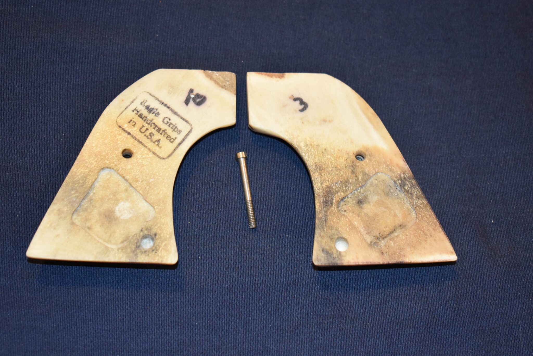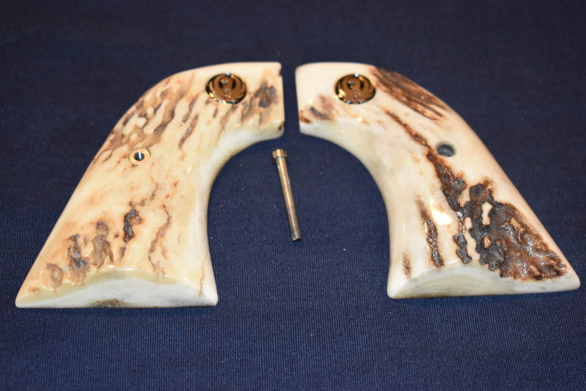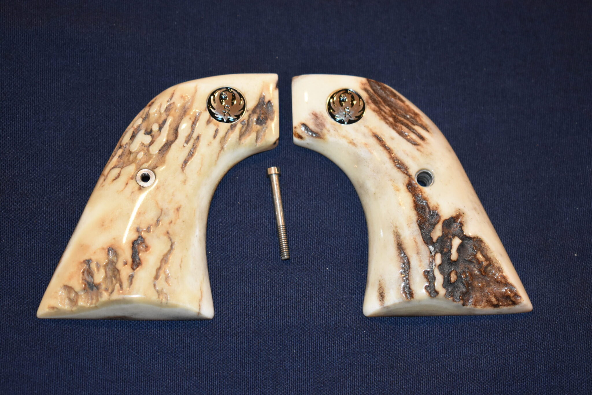 THIS IS A CUSTOM SET OF SAMBAR STAG GRIPS MADE TO FIT THE RUGER NEW MODEL VAQUERO. THEY WILL NOT FIT THE OLD VAQUERO OR NEW MODEL BLACKHAWK. THEY WILL FIT THE ANNIVERSARY MODEL BLACKHAWK & THE MONTADO. THESE ARE MADE FROM GENUINE SAMBAR STAG NOT IMITATION. THEY Â HAVE RUGER MEDALLIONS INSTALLED & SOME GREAY BARK COVERAGE!. THEY ARE SHOWN MOUNTED ON A STAINLESS .357 MAGNUM RUGER NEW MODEL VAQUERO. TAKE A CLOSE LOOK AT THE PICTURES AS THEY DESCRIBE THE GRIPS BETTER THAN WORDS. AS WITH ALL NATURAL MATERIAL THERE MAY BE SOME FITTING REQUIRED. SHIPPING WILL BE $8.50 PRIORITY MAIL.