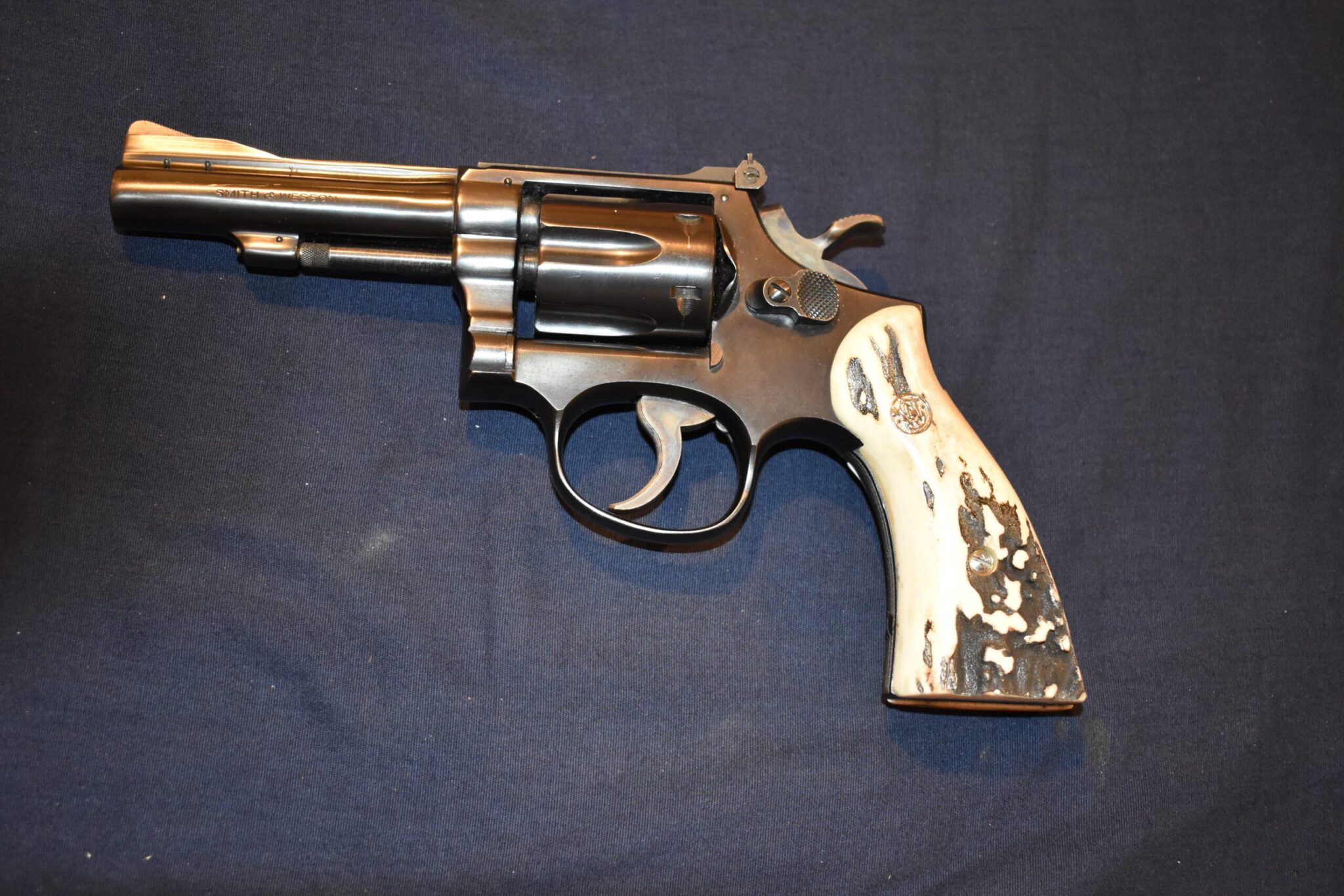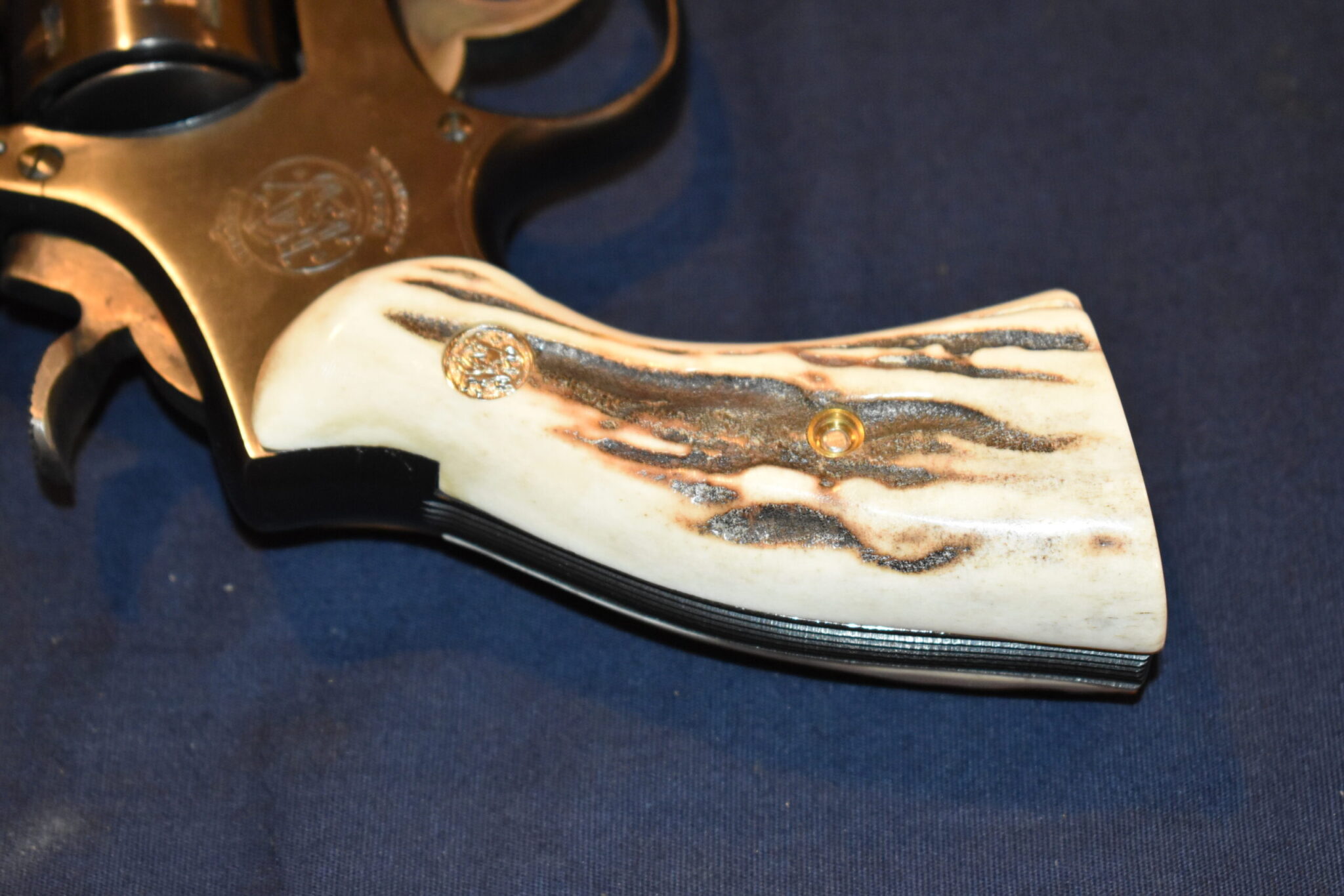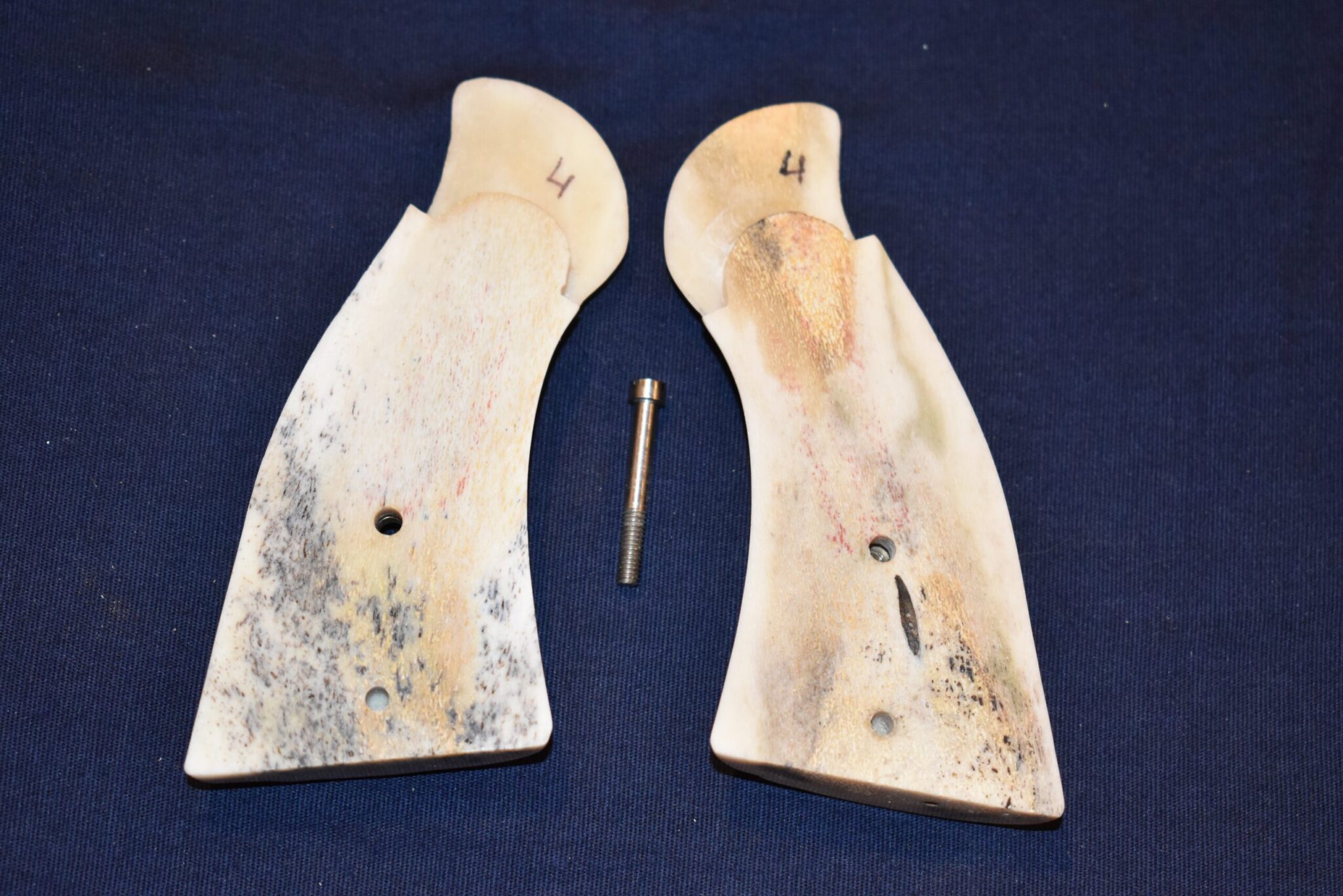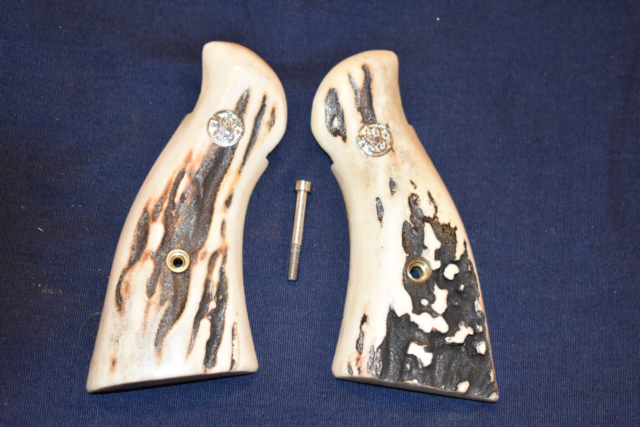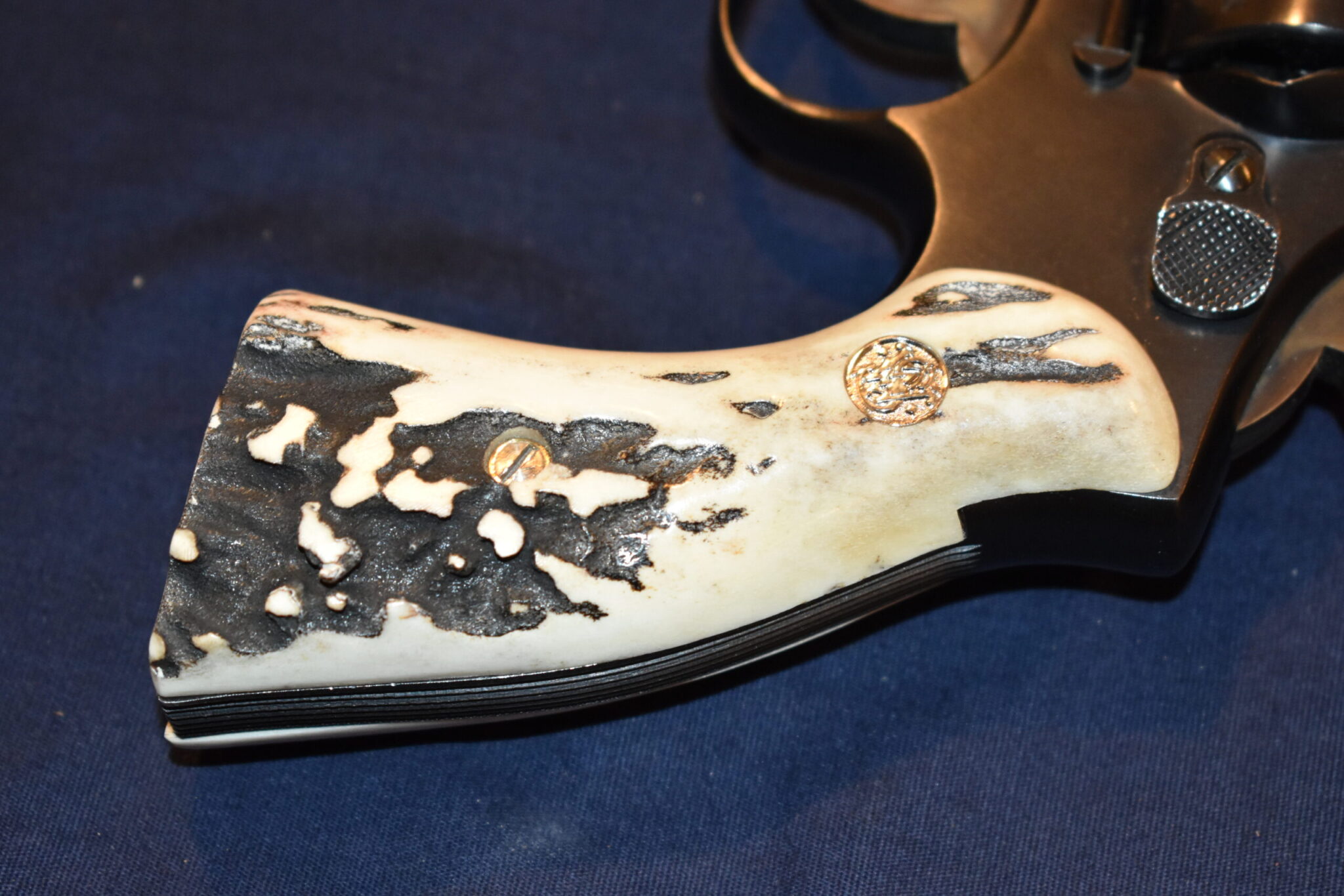 THIS IS A CUSTOM SET OF SAMBAR STAG GRIPS THAT FIT THE SMITH & WESSON K OR L FRAME SQUARE BUTT REVOLVERS. THESE WILL NOT FIT THE ROUND BUTT REVOLVERS. THESE ARE GENUINE SAMBAR STAG NOT IMITATION. THIS SET HAS SOME VERY NICE BARK COVERAGE. THEY HAVE S&W MEDALLIONS INSTALLED. THEY ARE SHOWN MOUNTED ON A 4″ PRE-MODEL 18. TAKE A CLOSE LOOK AT THE PICTURES AS THEY DESCRIBE THE GRIPS BETTER THAN WORDS. SHIPPING WILL BE $8.50 PRIORITY MAIL.