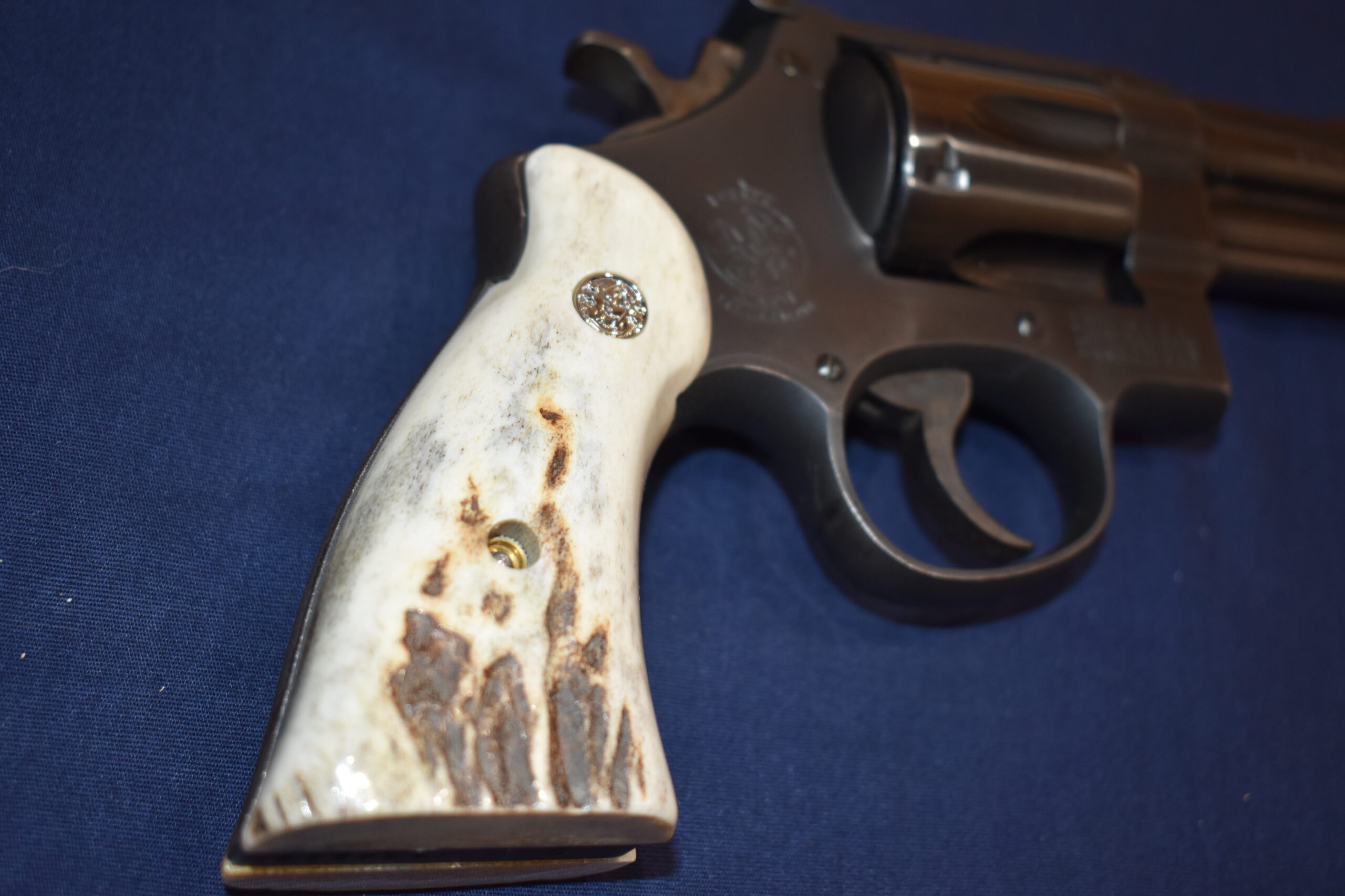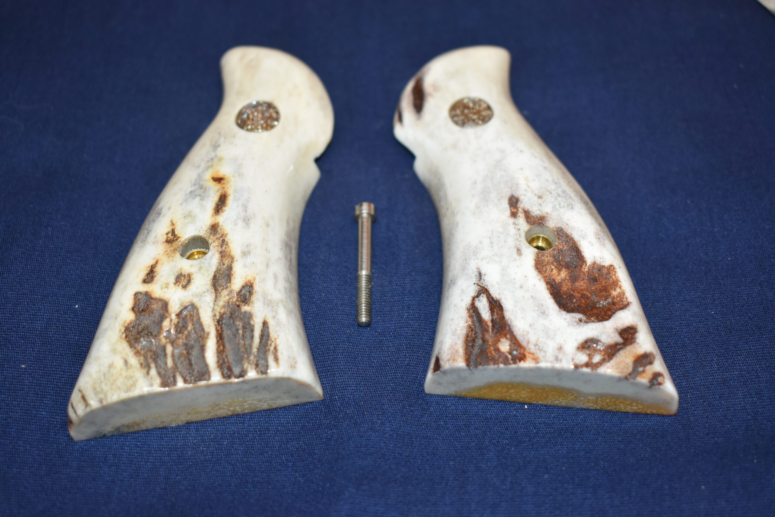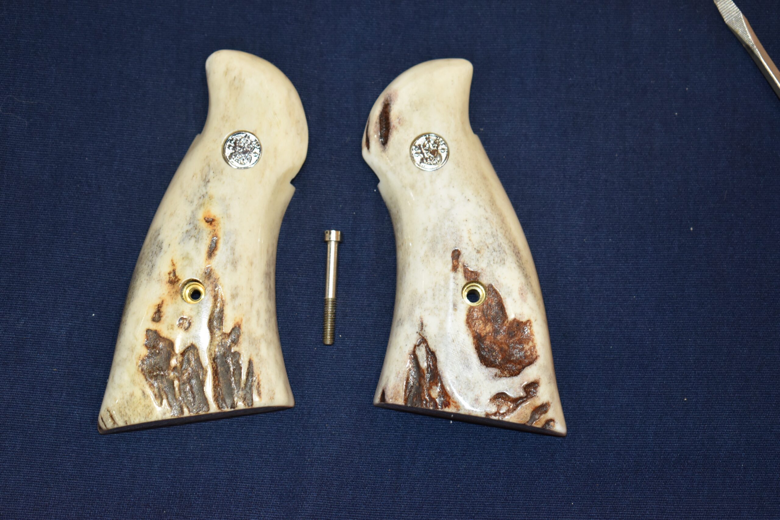 THIS IS A CUSTOM SET OF PREMIUM GRADE SAMBAR STAG GRIPS THAT FIT THE SMITH & WESSON N FRAME SQUARE BUTT REVOLVERS. THESE WILL NOT FIT THE ROUND BUTT REVOLVERS. THESE ARE GENUINE SAMBAR STAG NOT IMITATION. THEY HAVE S&W MEDALLIONS INSTALLED AND SOME REALLY NICE BARK COVERAGE. THEY ARE SHOWN MOUNTED ON A 4″ PRE MODEL 28. THEY ARE A LITTLE OVERSIZED AND WILL REQUIRE SOME SLIGHT FITTING. TAKE A CLOSE LOOK AT THE PICTURES AS THEYÂ DESCRIBEÂ THE GRIPS BETTER THAN WORDS.