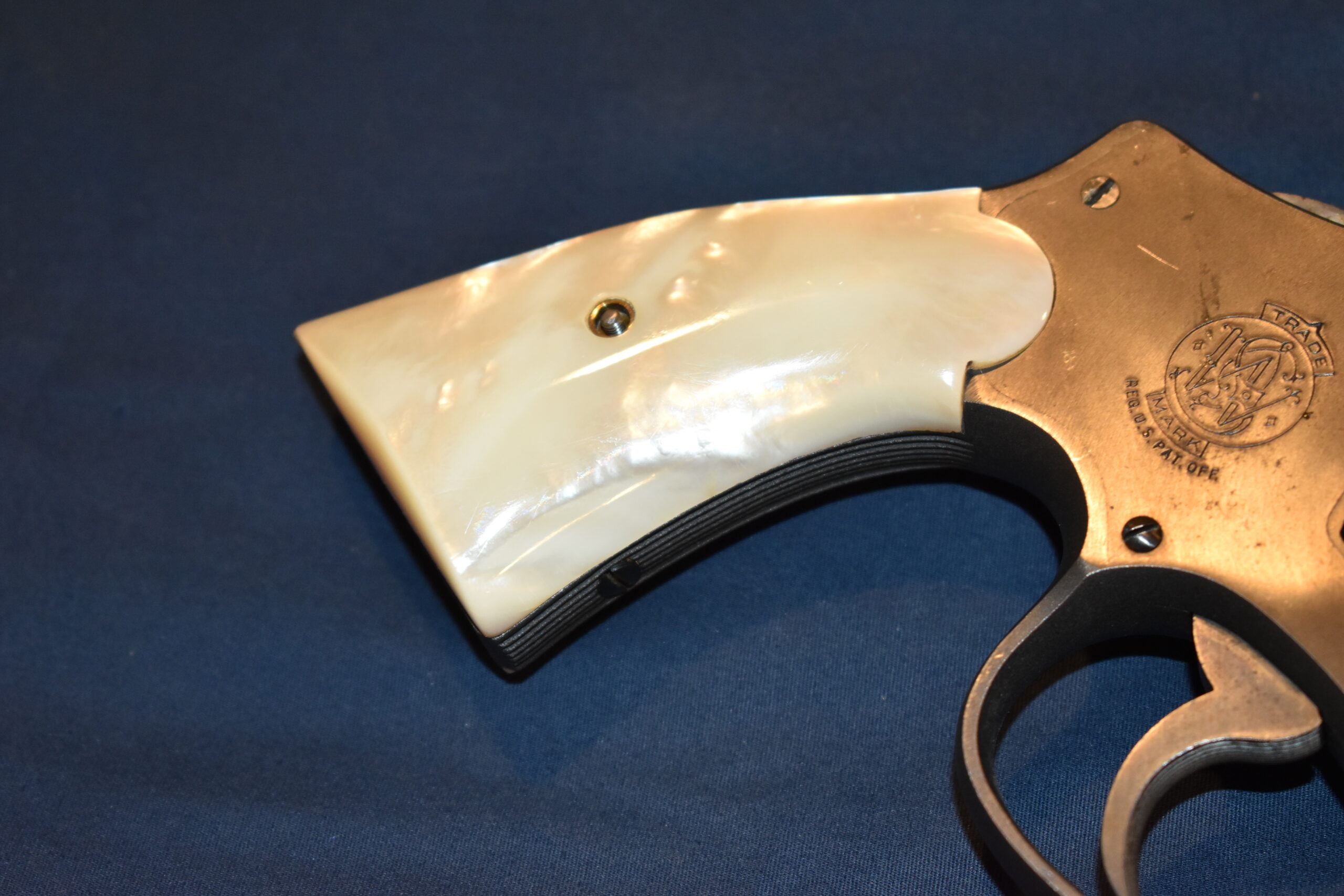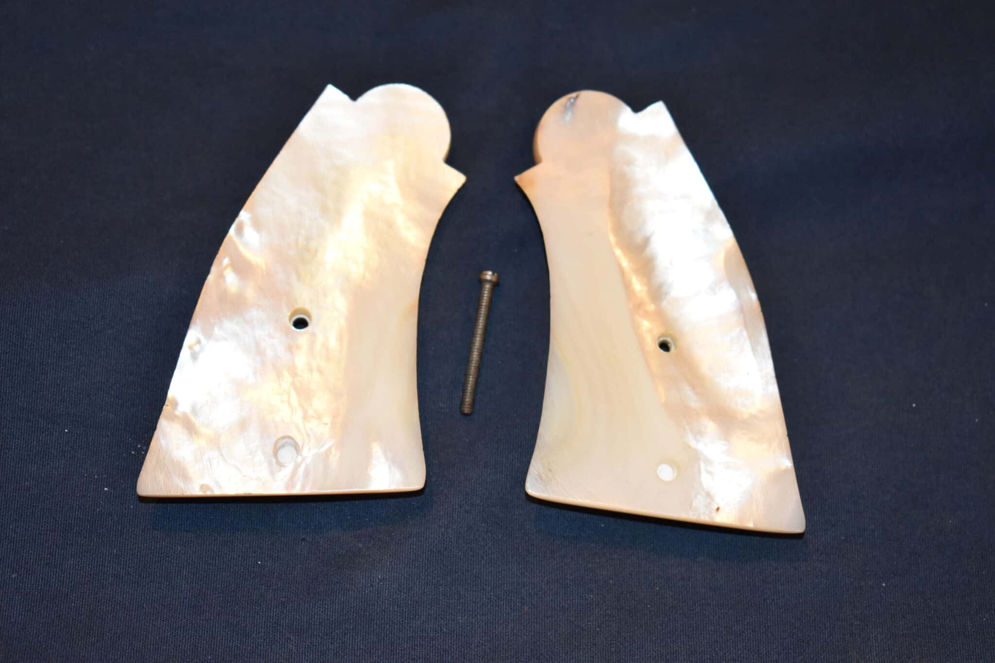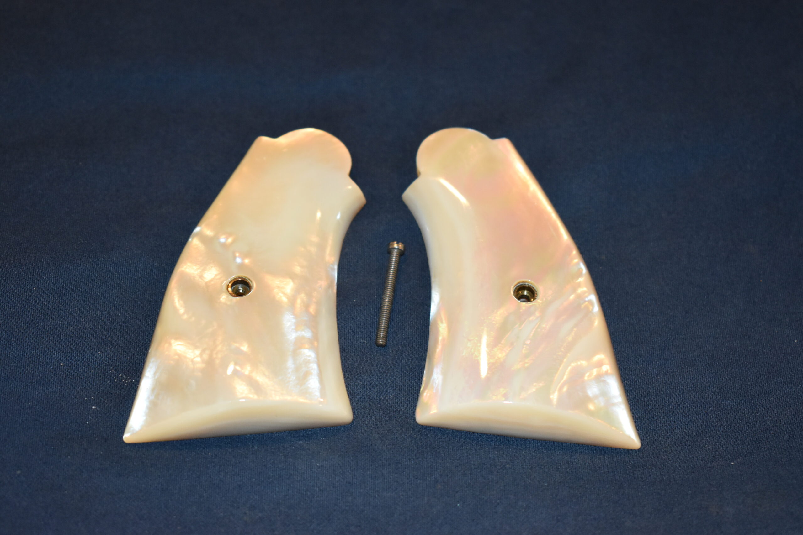 THIS IS A CUSTOM SET  MOTHER OF PEARL GRIPS MADE TO FIT THE SMITH & WESSON N FRAME SQUARE BUTT PRE-WAR REVOLVERS. THESE WILL NOT FIT THE ROUND BUTT REVOLVERS. THESE ARE GENUINE MOTHER OF PEARL NOT IMITATION. THESE ARE CUT IN THE OLDER SERVICE STYLE THAT FIT UP INTO THE FRAME.  MOTHER OF PEARL HAS LONG BEEN A STATUS SYMBOL AND FINDING A VINTAGE CARVED SET LIKE THESE IS ALMOST IMPOSSIBLE. THEY ARE SHOWN MOUNTED ON A 5 SCREW PRE-MODEL 28.  TAKE A CLOSE LOOK AT THE PICTURES AS THEY DESCRIBE THE GRIPS BETTER THAN WORDS. SHIPPING WILL BE $18.50 PRIORITY MAIL WITH INSURANCE.